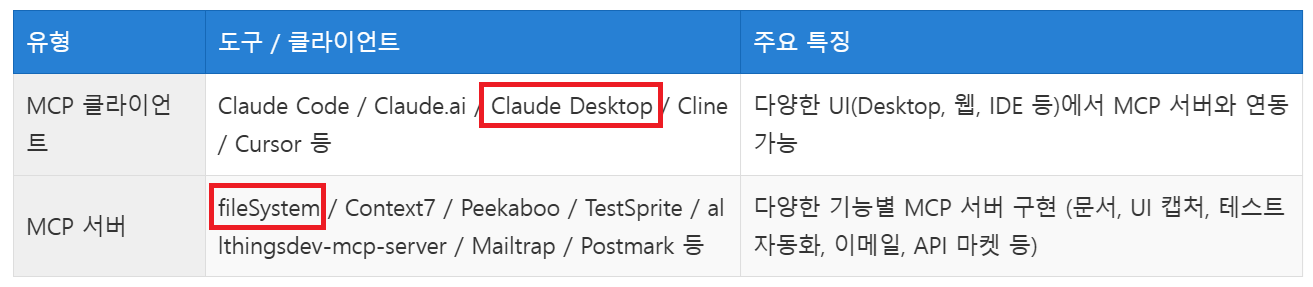 | MCP 클라이언트 | Claude Code / Claude.ai / Claude Desktop / Cline / Cursor 등 | 다양한 UI(Desktop, 웹, IDE 등)에서 MCP 서버와 연동 가능 |