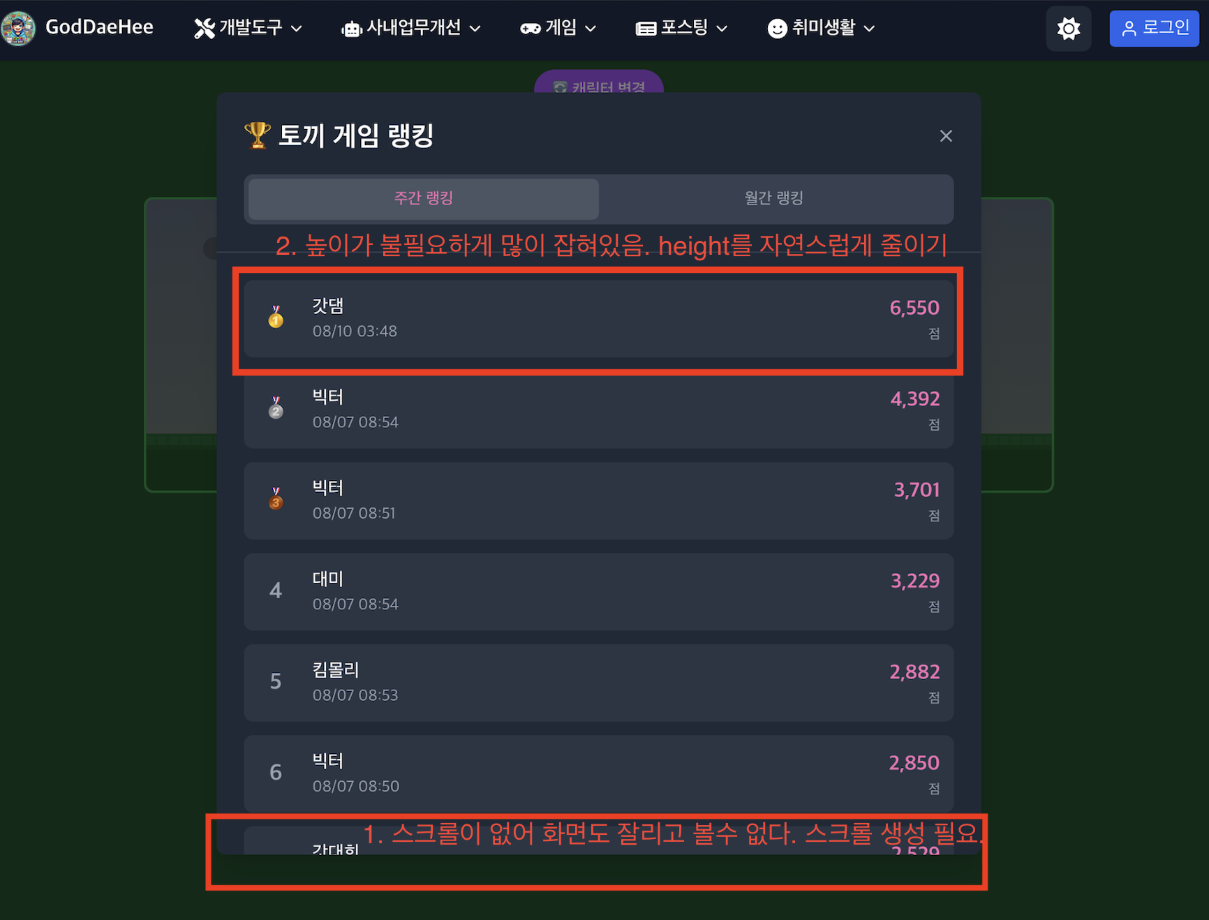 버그2 : 랭킹 페이지에 스크롤이 없어 스크롤이 되지 않는다. 이 부분을 스크롤을 가능하게 개선하고 랭킹 1개의 높이(height)가 너무 높다. 이 높낮이까지 가능하면 줄여보자.