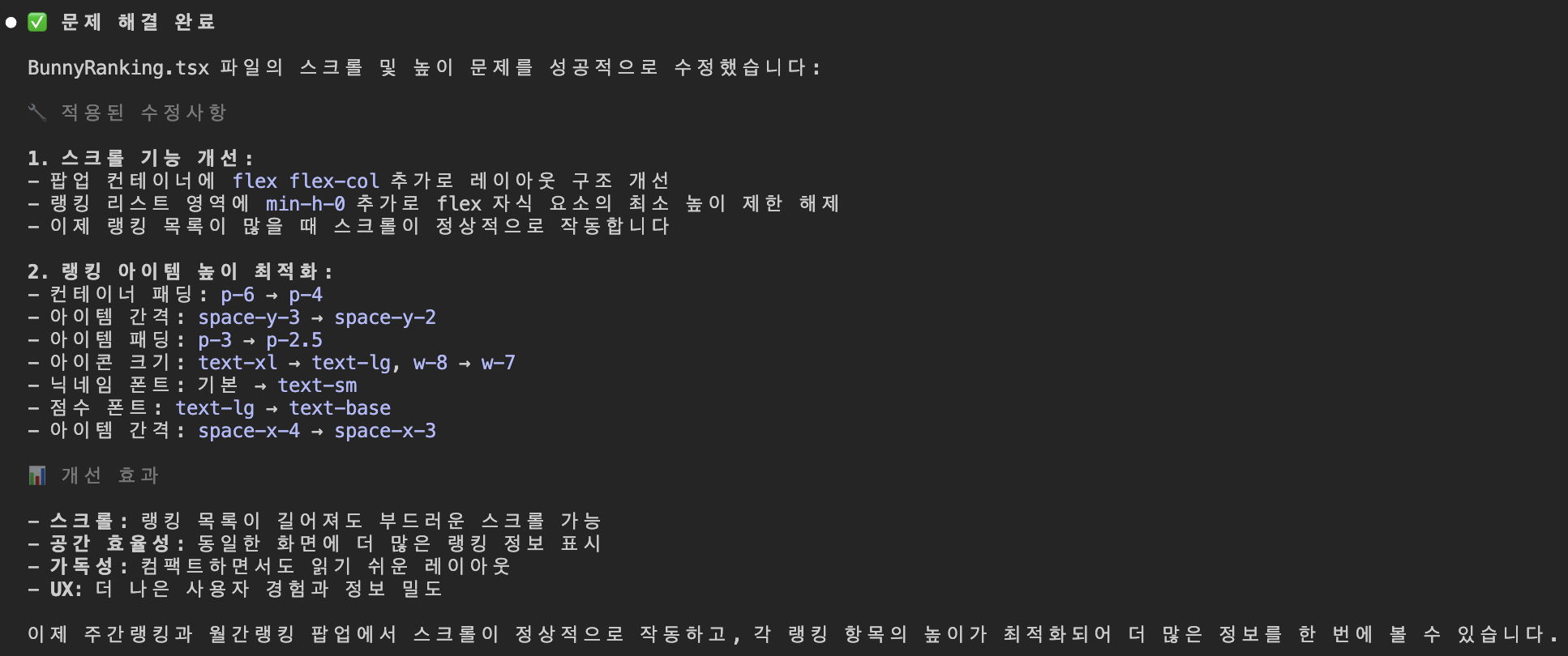 /sc:troubleshoot "(대상 파일 : BunnyRanking.tsx 경로 : /bunny-run 내 주간랭킹,월간랭킹 클릭시 나오는 레이어 팝업) 랭킹 페이지에 스크롤이 없어 스크롤이 되지 않는다. 이 부분을 스크롤을 가능하게 개선하고 랭킹 1개의 높이(height)가 너무 높으므로 개선이 필요해. " --think