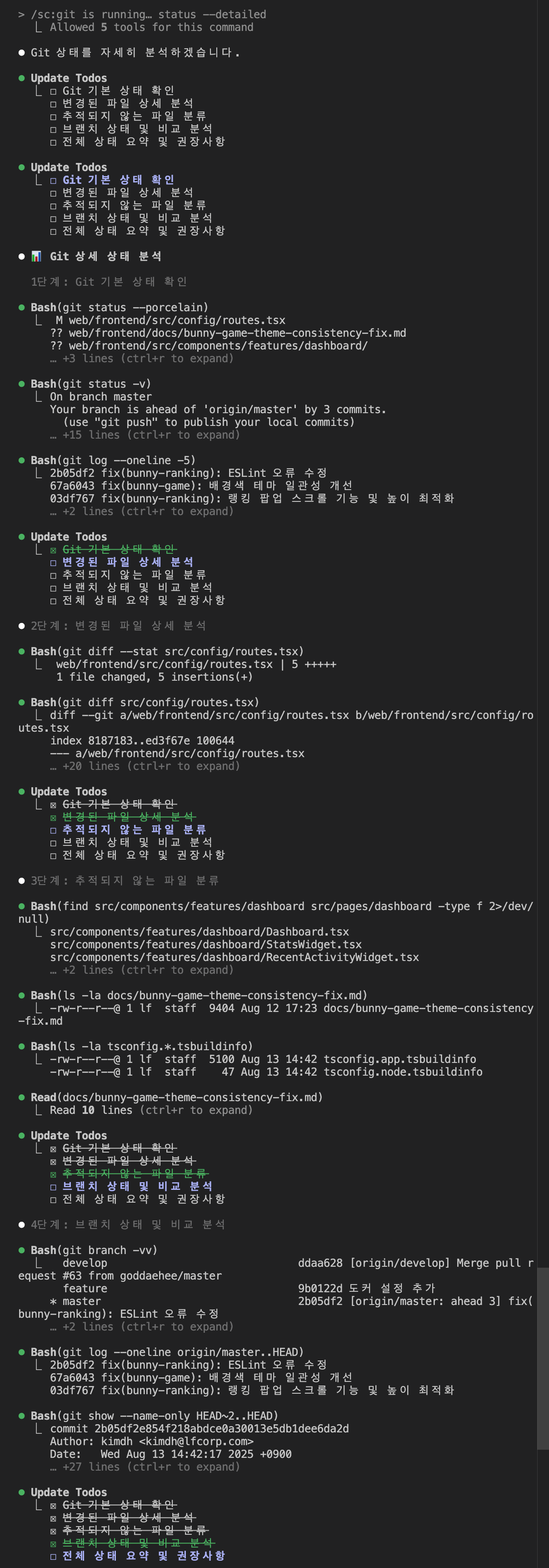/sc:git 명령어란? SuperClaude의 /sc:git은 Git 작업을 자동화하고 최적화하는 명령어이다. Git Expert와 DevOps 페르소나가 적용되어 전문적인 Git 워크플로우를 제공한다.