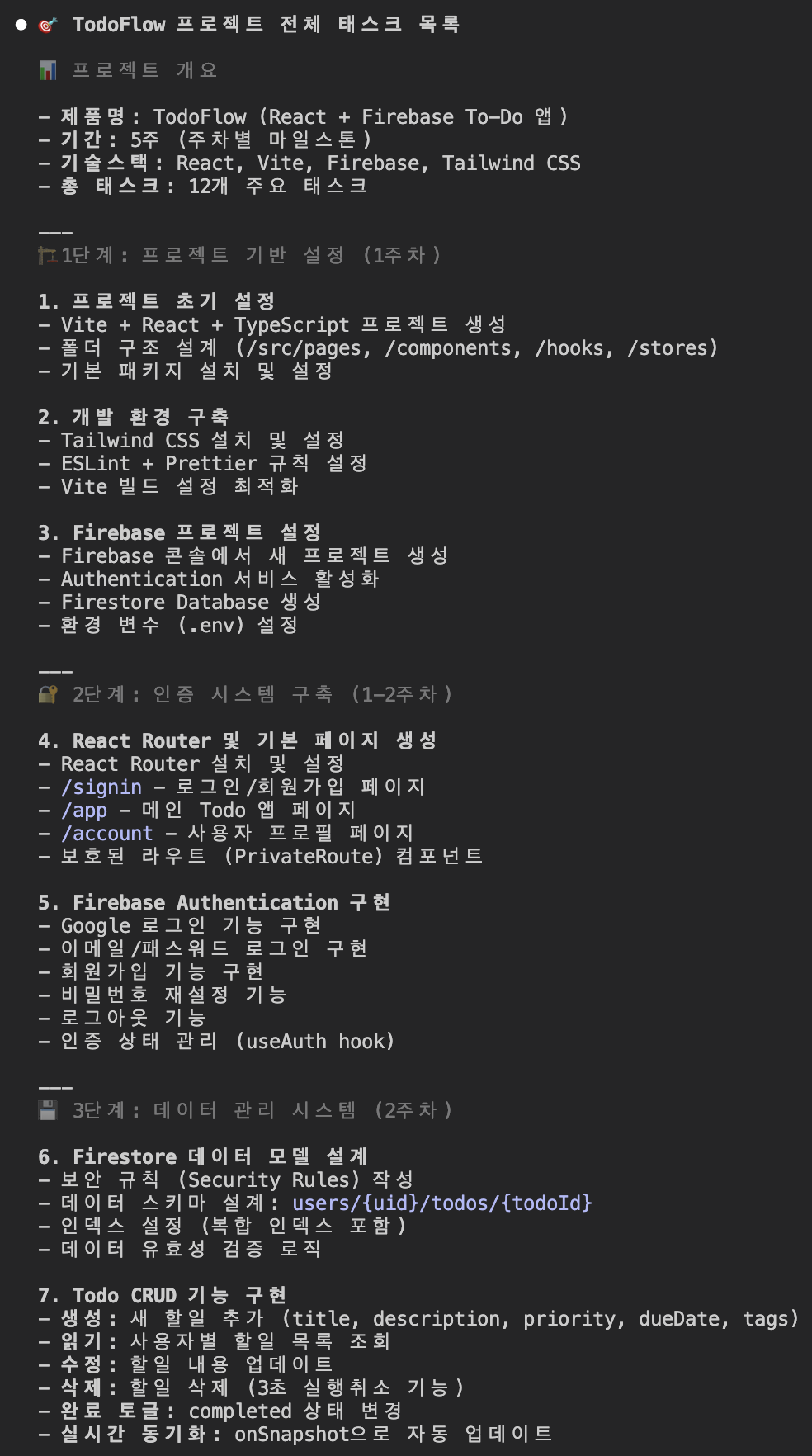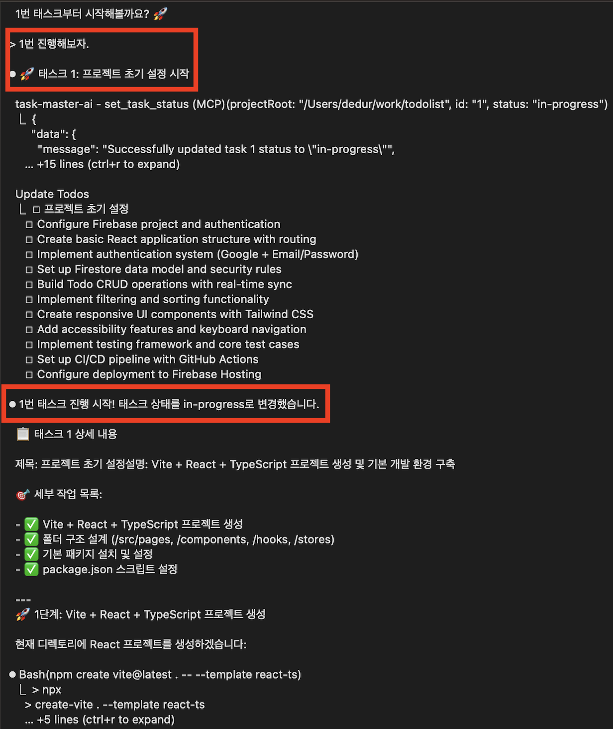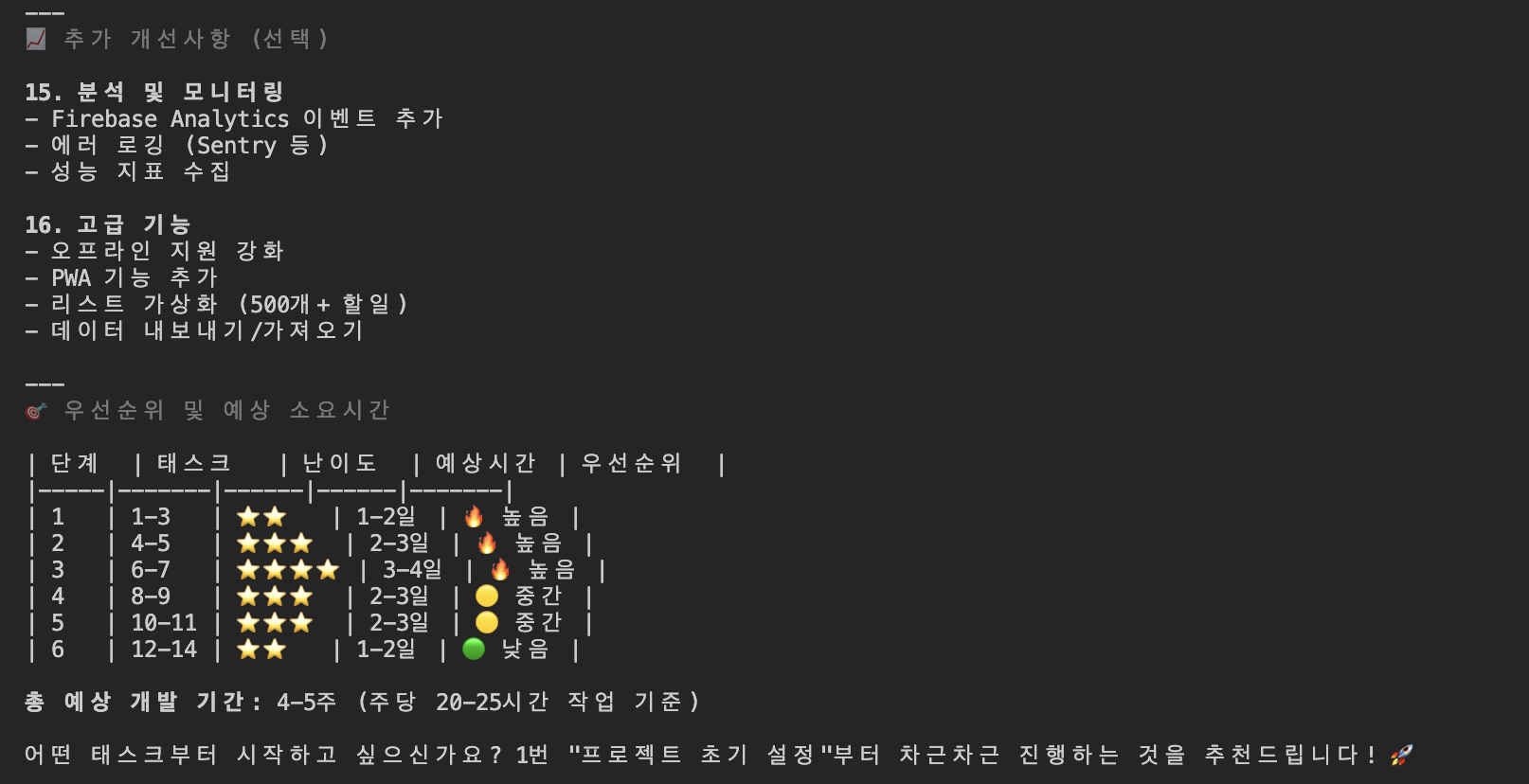 위와 같이 PRD를 작성한 뒤 AI에게 "PRD를 분석해서 초기 작업 목록을 만들어줘"라고 요청하면, AI는 이 문서를 바탕으로 프로젝트를 완성하기 위한 모든 단계를 체계적으로 추출해줄 것이다.
