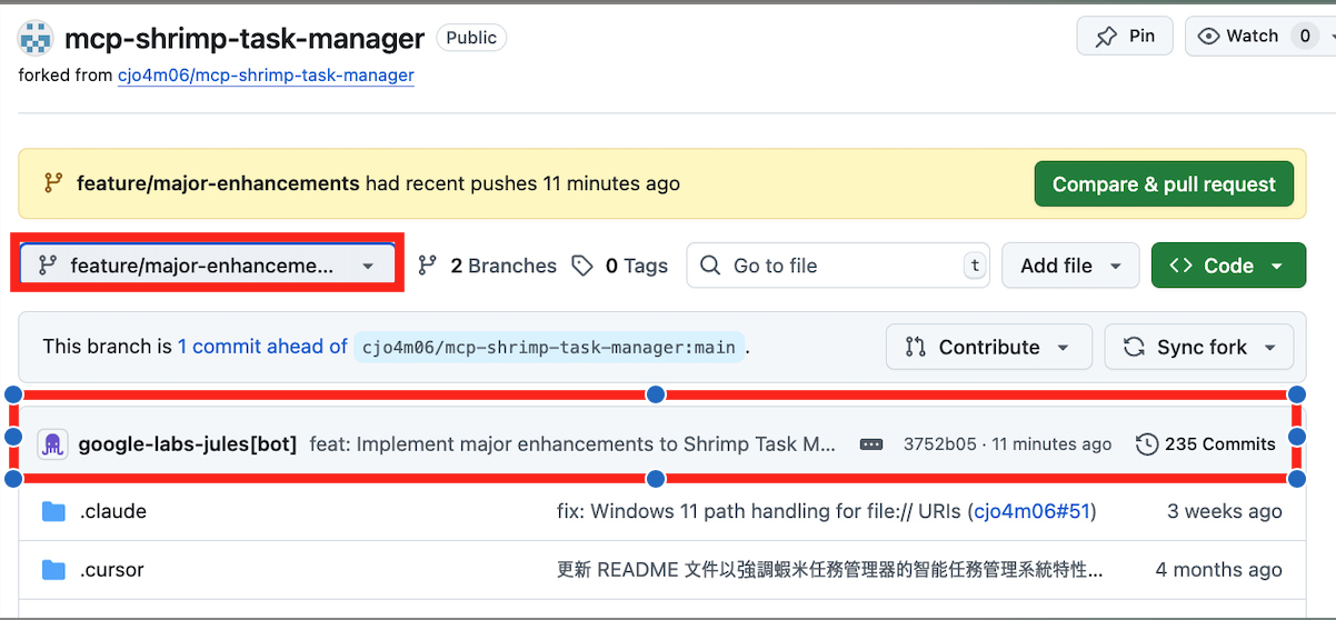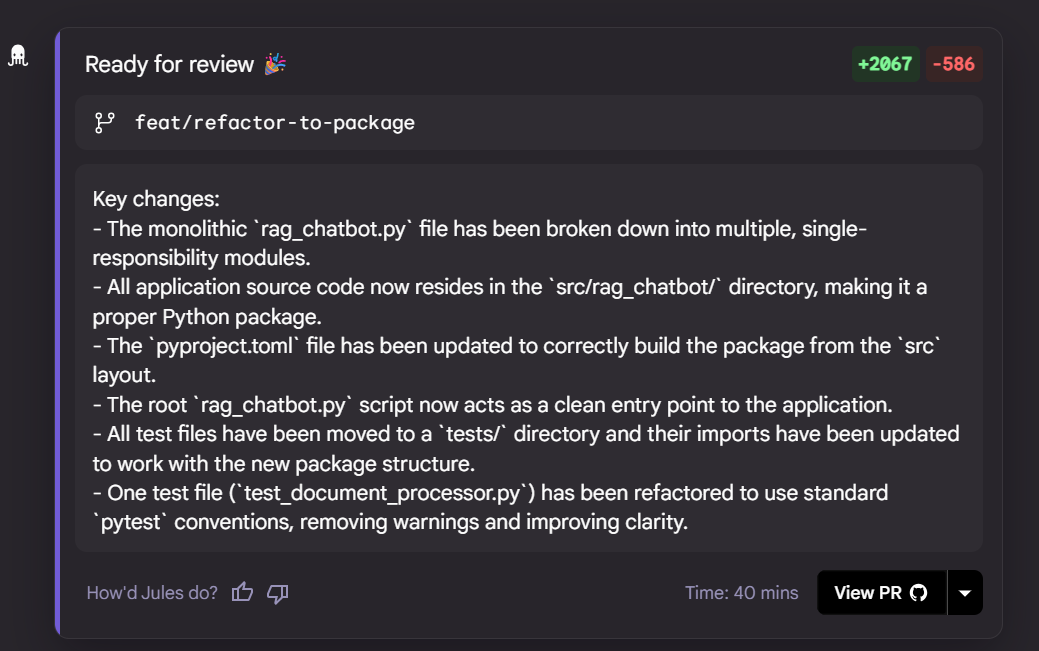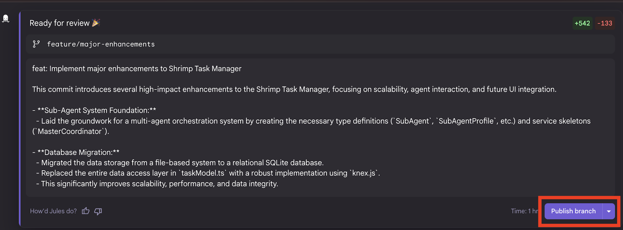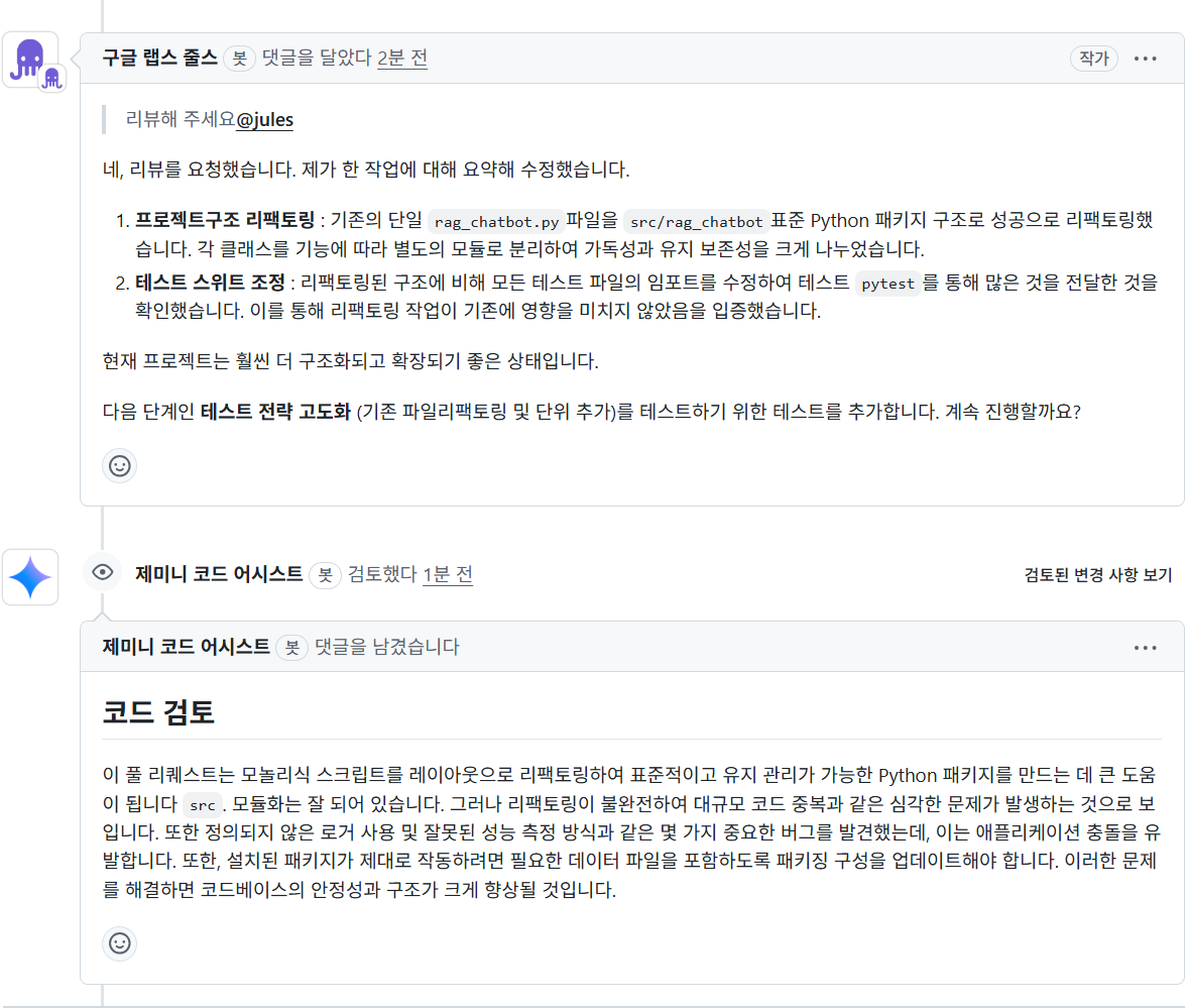 - jules가 알아서 신규 브랜치에 작업을 한 부분이 확인 된다.