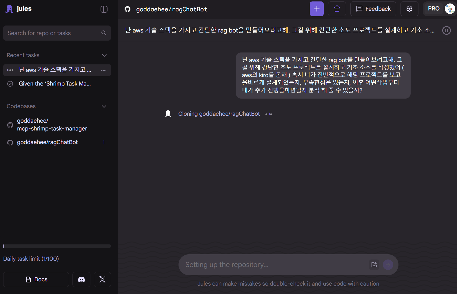 다만 이번 실습은 상기에 나와 있듯이 줄스의 특징이 비동기적으로 작업을 수행하는 것이 특징이라고 하니 복잡한 요청을 해보고, 알아서 혼자 작업을 잘하는지 살펴보는 취지에서 실습을 해보도록 하겠다.