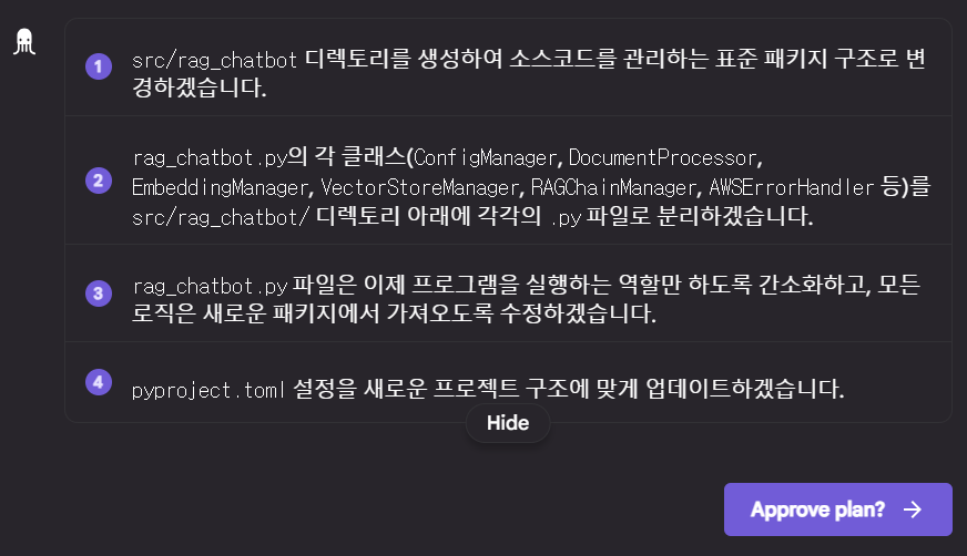 바로 코드를 생성하는 게 아니라 먼저 계획을 보여주고 승인을 받는다.