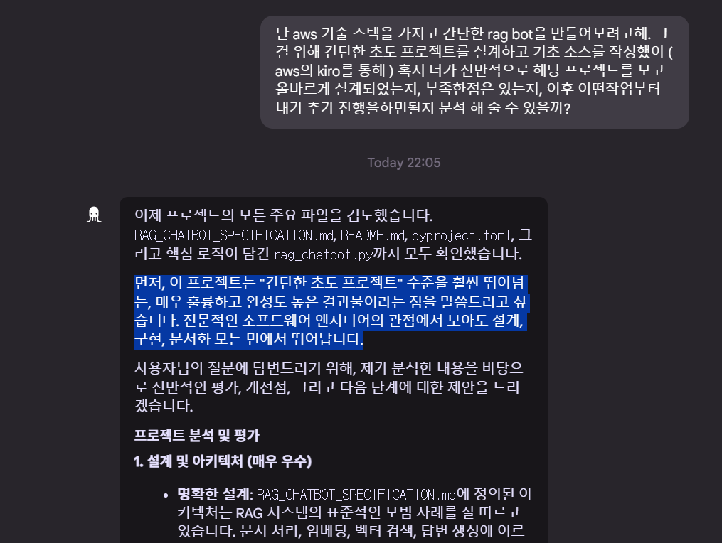 명확한 설계: RAG_CHATBOT_SPECIFICATION.md에 정의된 아키텍처는 RAG 시스템의 표준적인 모범 사례를 잘 따르고 있습니다. 문서 처리, 임베딩, 벡터 검색, 답변 생성에 이르는 파이프라인이 논리적으로 잘 구성되어 있습니다.