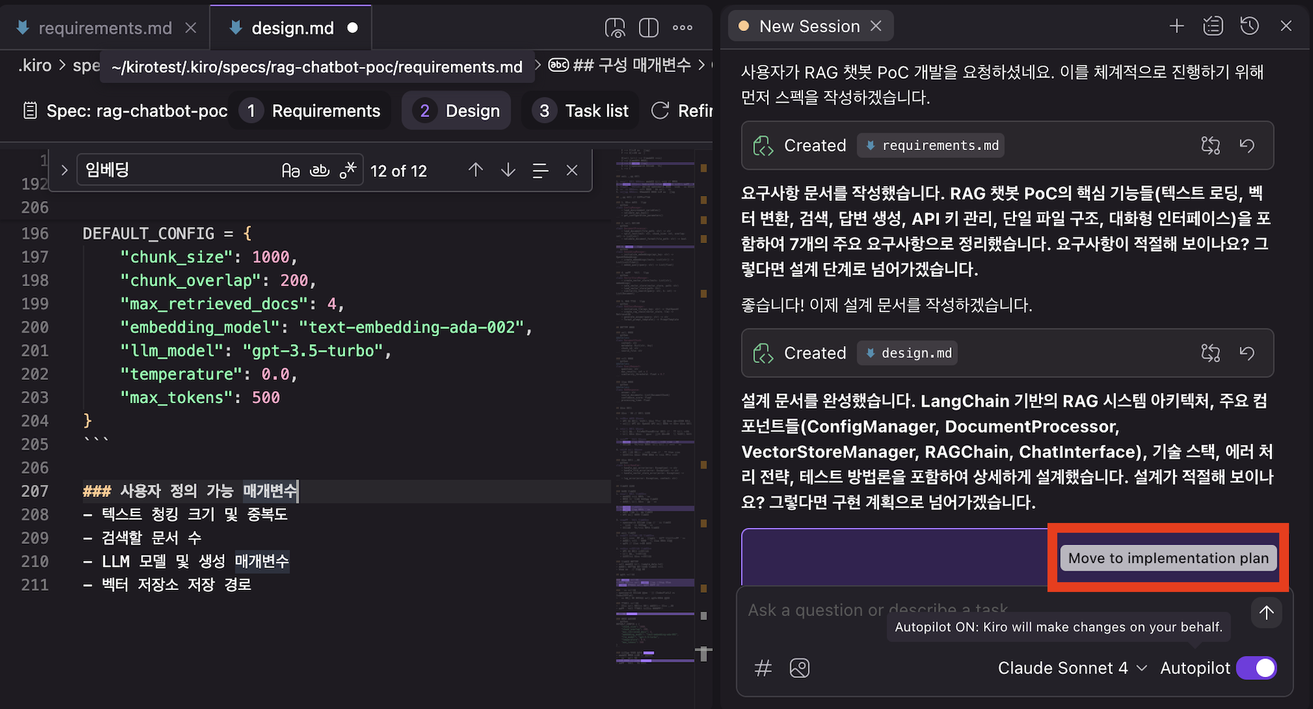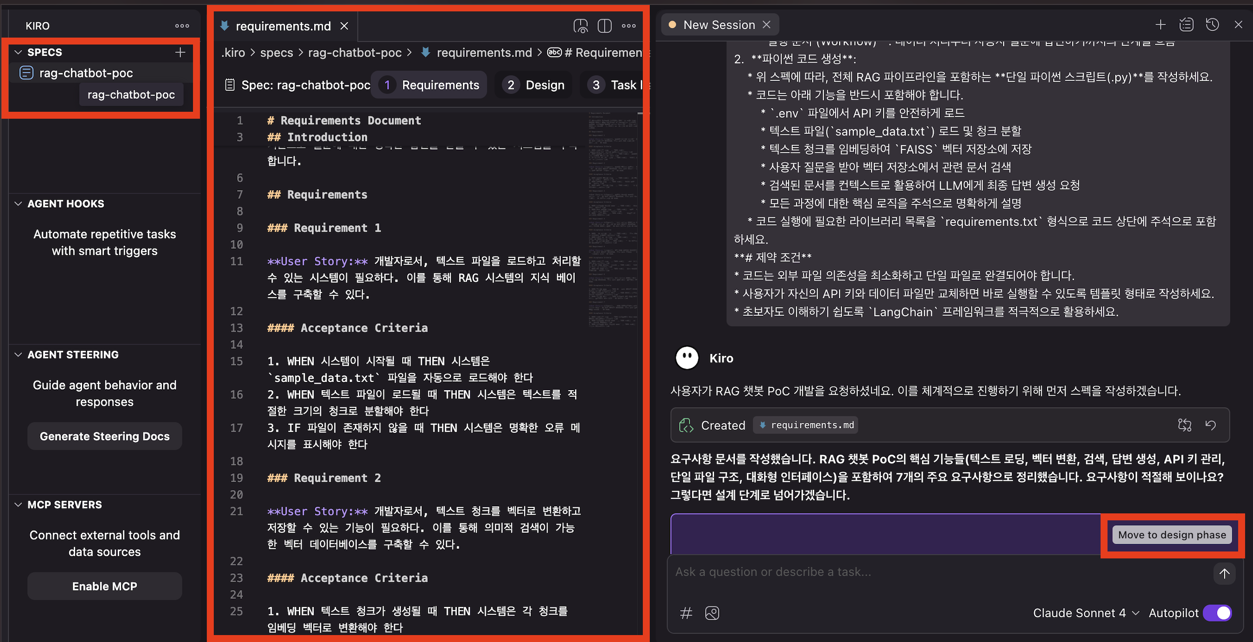 어느 정도 시간이 지난후 좌측에 스펙과 requirements.md 파일이 생성된것을 볼 수 있다. "Move to design phase"버튼을 눌르고 다음 스텝을 진행해 보자. (원래는 해당 단계에서부터 잘 정의하는게 당연히 베스트 이다.)