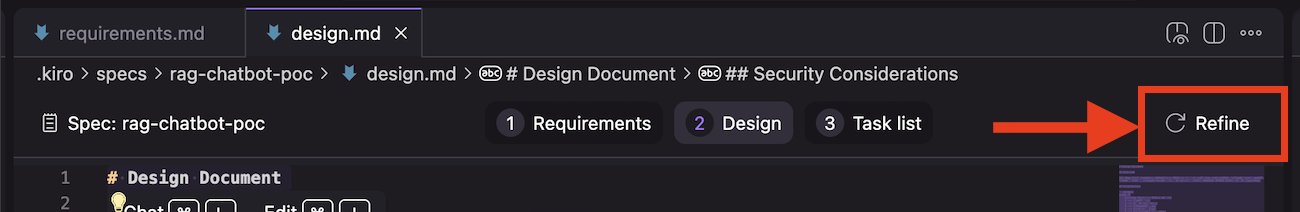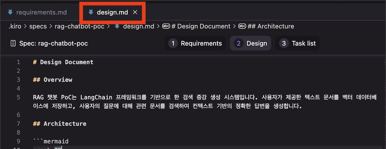 요구사항이 정의되면 Kiro는 design.md 파일을 통해 시스템 아키텍처를 설계한다.