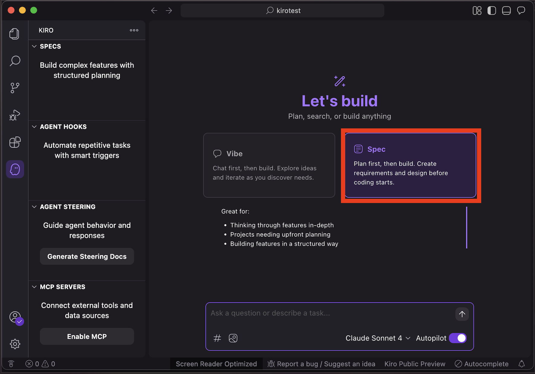 Kiro의 경우엔 MCP가 아닌 IDE의 차원에서 좀더 UI적으로도, 기능적으로도 발전되어 있어 보인다. AI와 함께 체계적인 소프트웨어 개발을 할 수 있도록 도와주는 통합 개발 환경이라고 볼 수 있다.