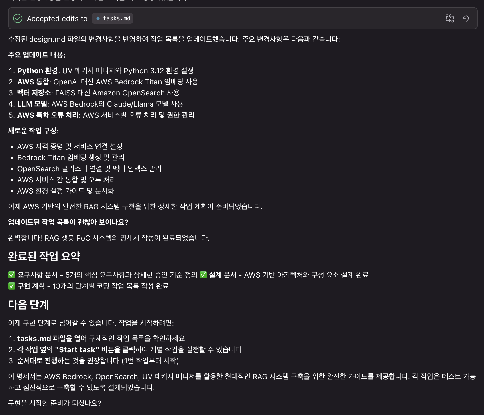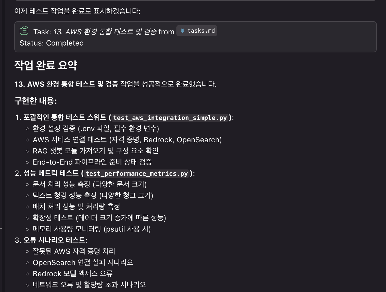 명확한 요구사항과 설계가 있으니 FAISS에서 AWS로의 기술 스택 변경도 큰 부담 없이 할 수 있었습니다. 이는 spec 기반 접근의 큰 장점입니다.
