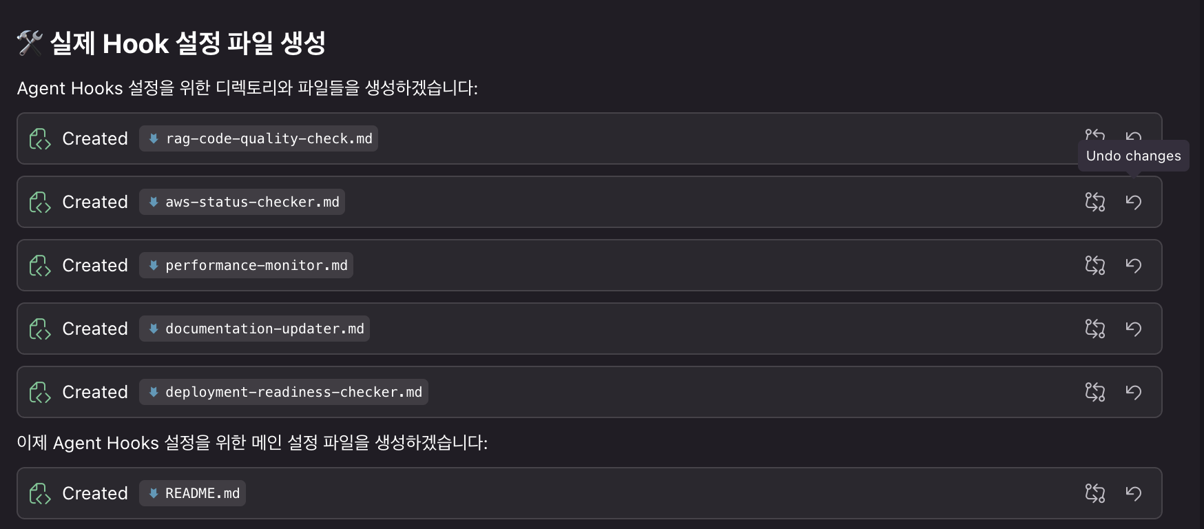 RAG 챗봇 프로젝트에서 사용할 5가지 Agent Hooks를 Kiro를 통해 생성 하였다.