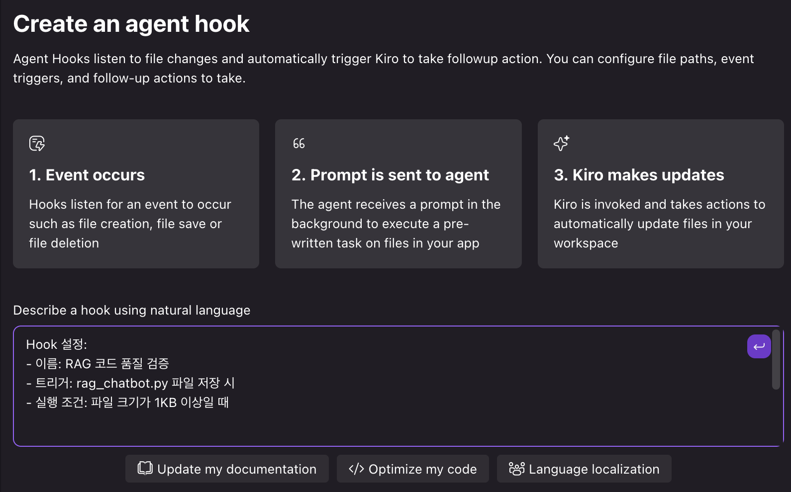 Kiro 사용방법(2) - Kiro Agent Hooks, Steering 설정 예시(Agent Hooks, Steering 설정 방법 with RAG 개발 환경 구축)