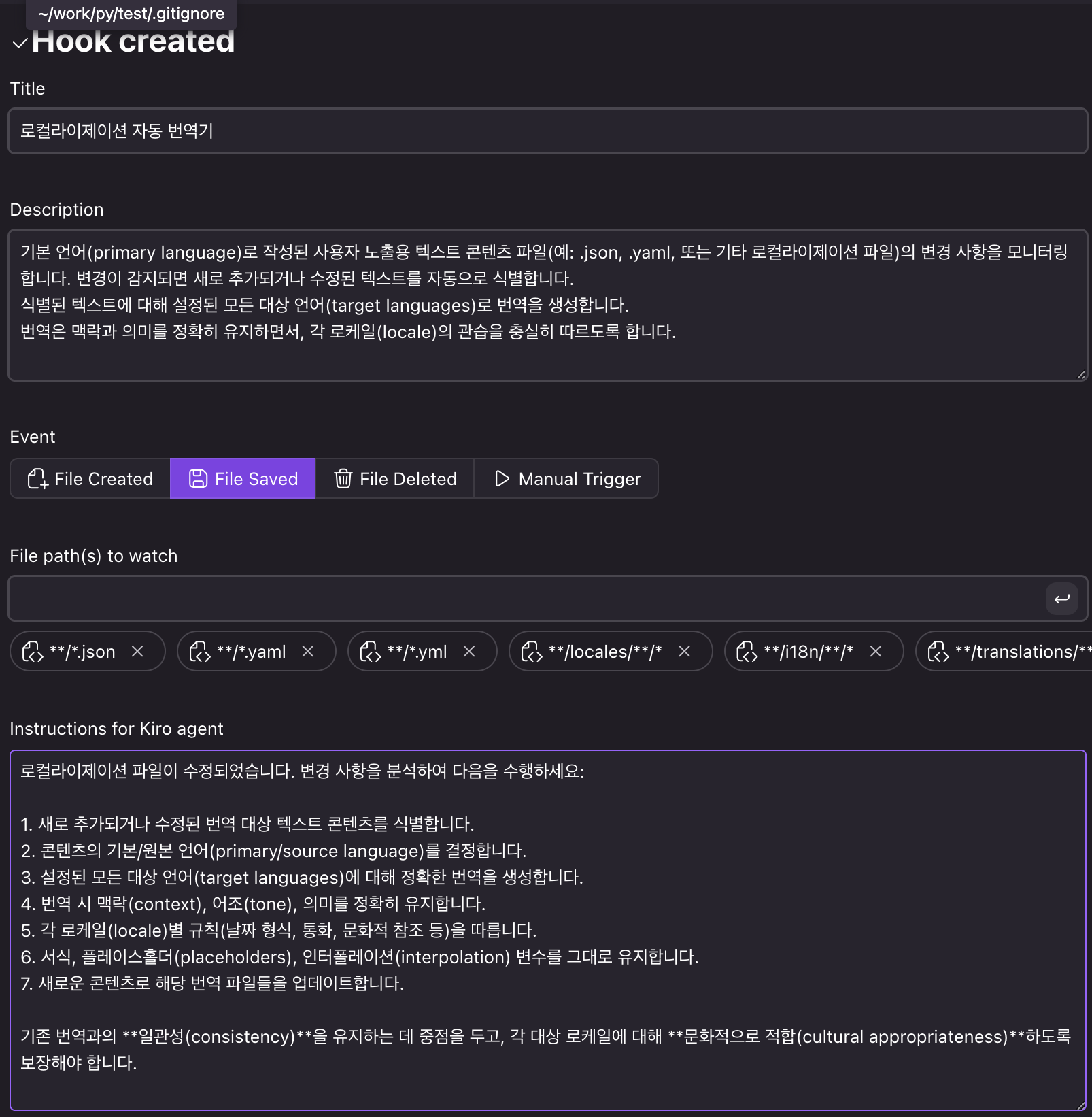 - 이런식으로 등록가능하니, kiro가 추천해준 훅 5개중에서 2개 먼저 등록 해 보도록 하겠다. ( 이후 불필요한 훅들은 삭제하도록 하자 )