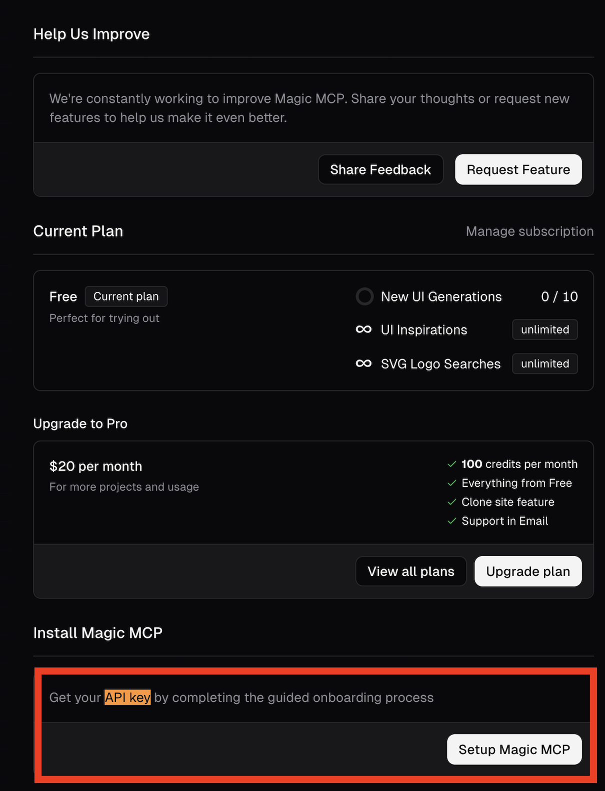 Magic MCP를 쓰려면 API 키가 필요하다. 베타 기간엔 무료.