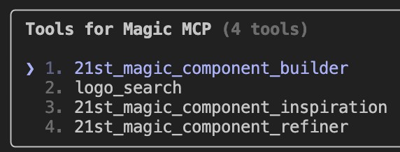 Magic MCP를 설치하면 4가지 강력한 도구를 사용할 수 있다. 각각의 도구는 특화된 기능을 제공한다.