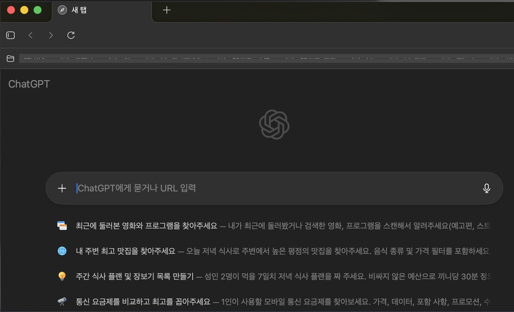 Atlas에서 새 탭을 열면 Google 검색창 대신 ChatGPT 프롬프트가 나타난다.