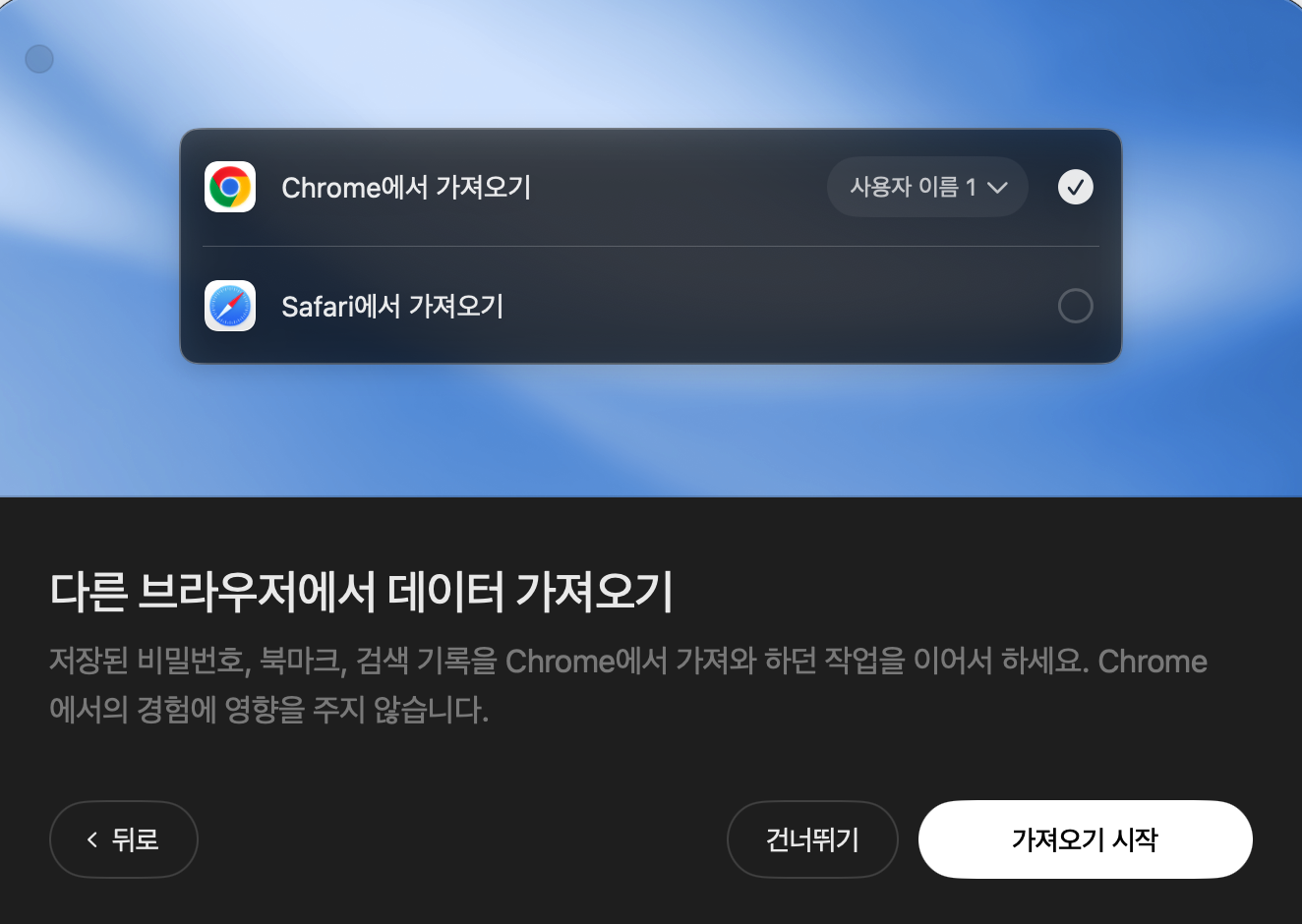 5. 데이터 가져오기: Chrome 또는 Safari에서 북마크, 비밀번호, 히스토리 가져오기 (선택사항)
