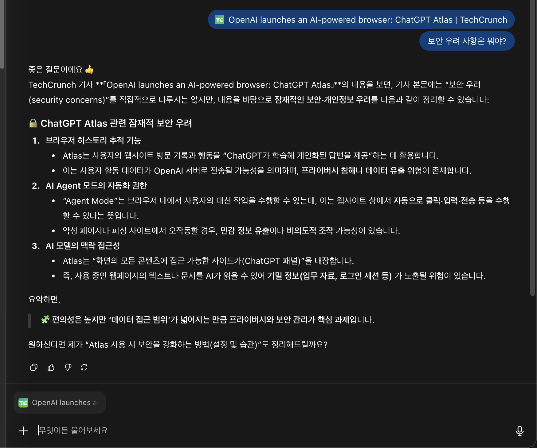 - AI 네이티브 설계의 차이: Atlas는 AI를 나중에 추가한 것이 아니라 처음부터 핵심으로 설계했다. 이는 단순히 확장 프로그램을 추가한 것과는 완전히 다른 경험을 제공한다.