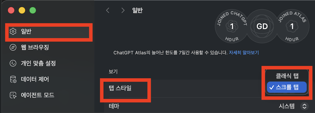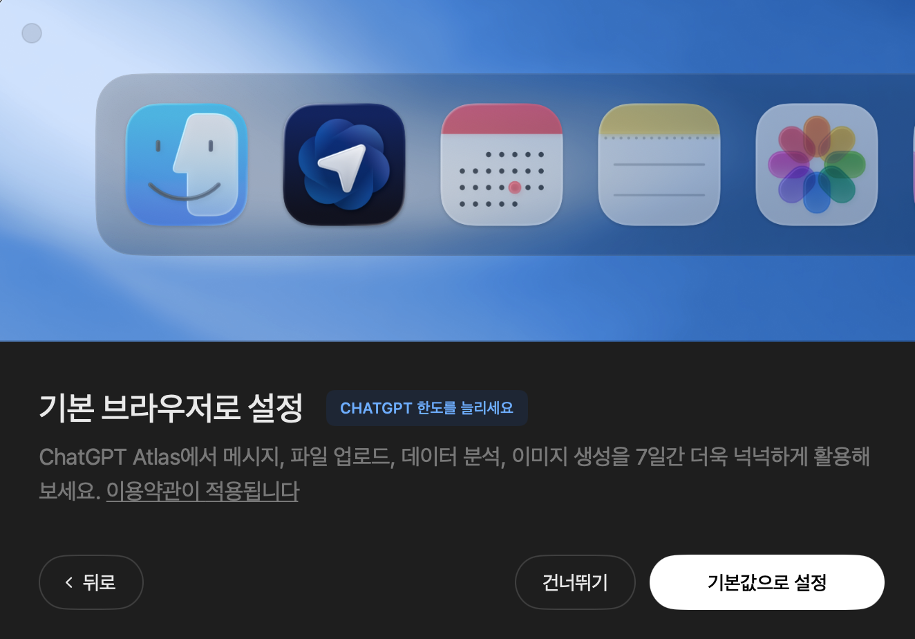 9. 기본 브라우저 설정: Atlas를 기본 브라우저로 설정하면 7일간 ChatGPT 사용량 제한 증가 한다고 한다.
