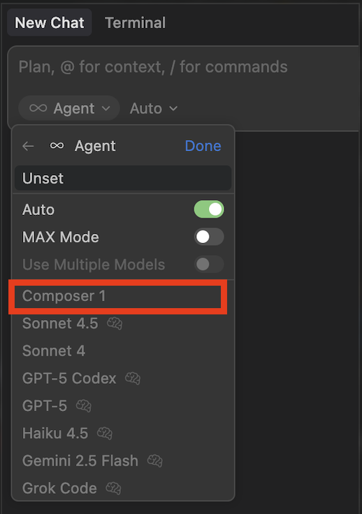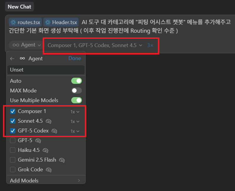 ex) 신규 모델인 Composer, Sonnet 4.5, Codex를 선택하고 자연어로 요청해본다.