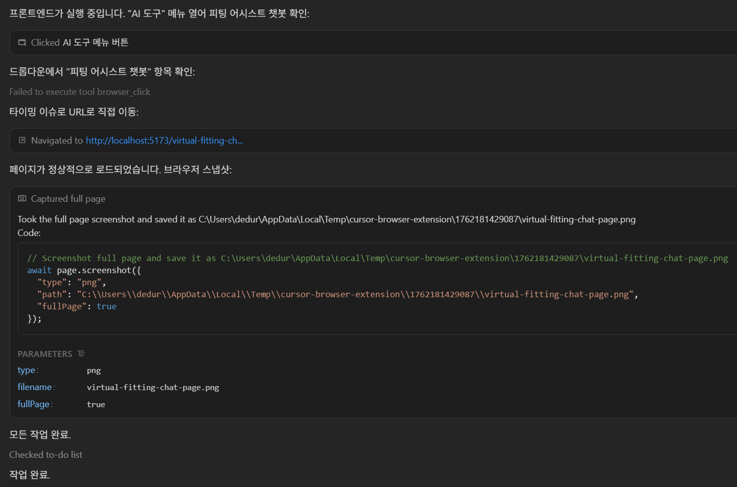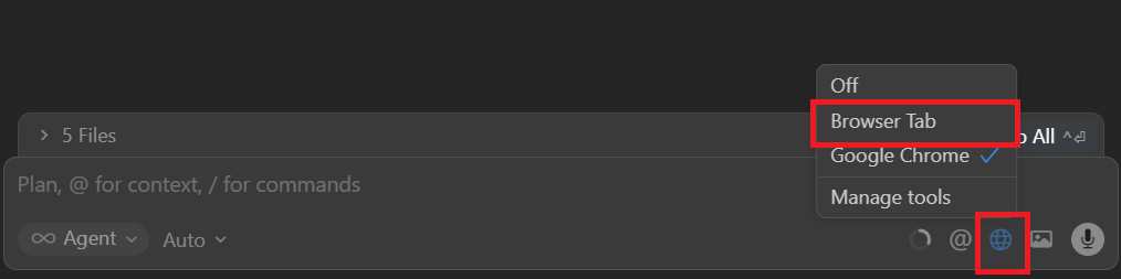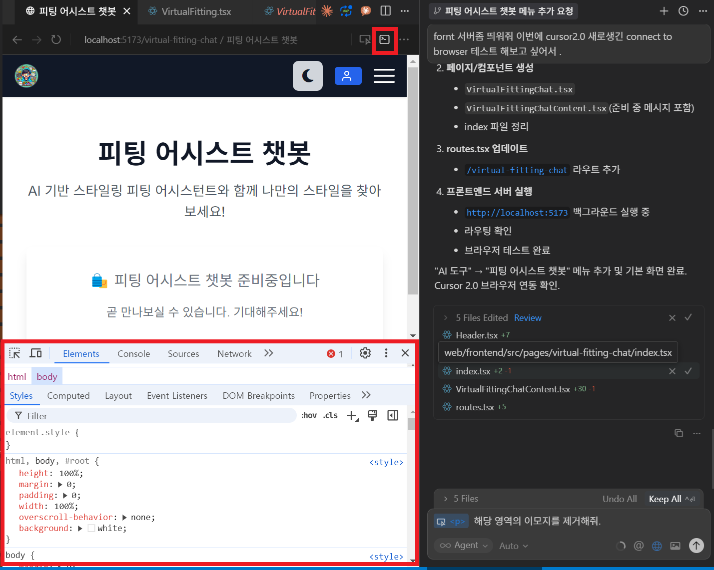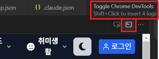 - Toggle Chrome DevTolls 버튼을 클릭하여 Cursor Browser Tab 안에서도 개발자 도구를 활성화할 수 있다.