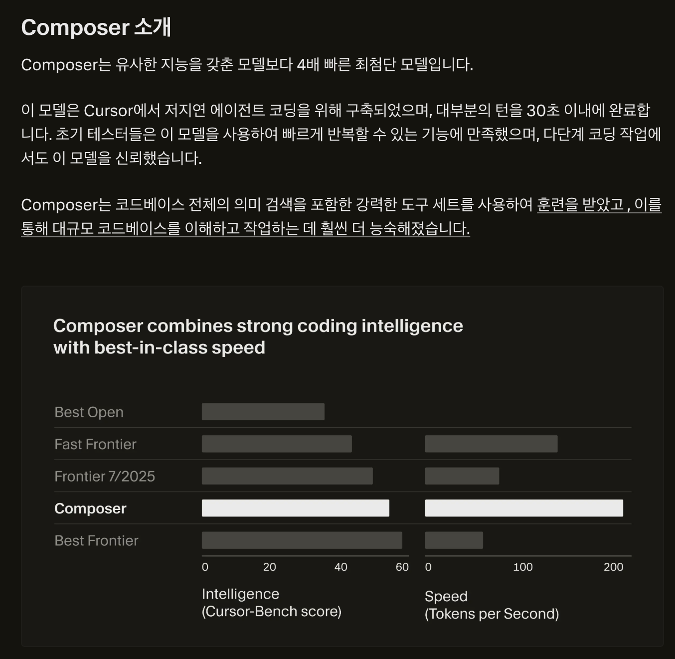 공식 문서 기반 Composer는 초당 250토큰을 생성하며, 이는 다른 최적화된 코드 모델보다 약 2배, 비슷한 수준의 프론티어 시스템보다 4배 빠른 속도이다. 모델은 실제 대규모 코드베이스에서의 소프트웨어 엔지니어링 문제를 해결하도록 강화학습으로 훈련되었다고 한다.