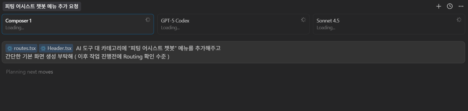 - 3개의 모델이 각각 작업을 시작한다. 실제로 수행해보면 Composer가 속도면에선 압도적이지만, 아마 아직 ㅜ컬리티는 codex, sonnet4.5가 더 좋을 것 같다.