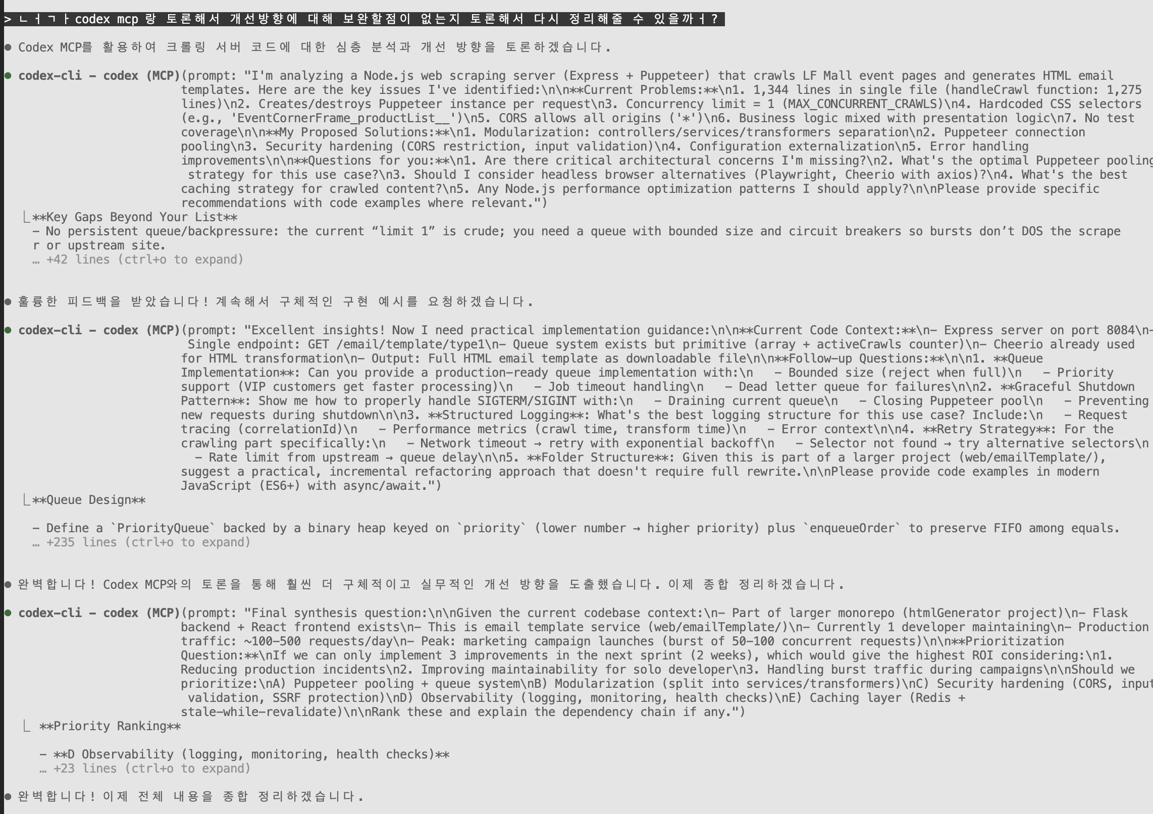 Claude Code가 Codex MCP 서버로 요청 처리하고, 수행해 나가는 모습이다.