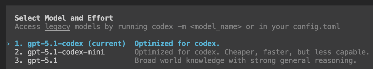 사용 가능한 모델 (2025년 11월 2주차 codex 5.1이 출시되어 업데이트 시 다음과 같이 신규 모델을 사용할 수 있다.)