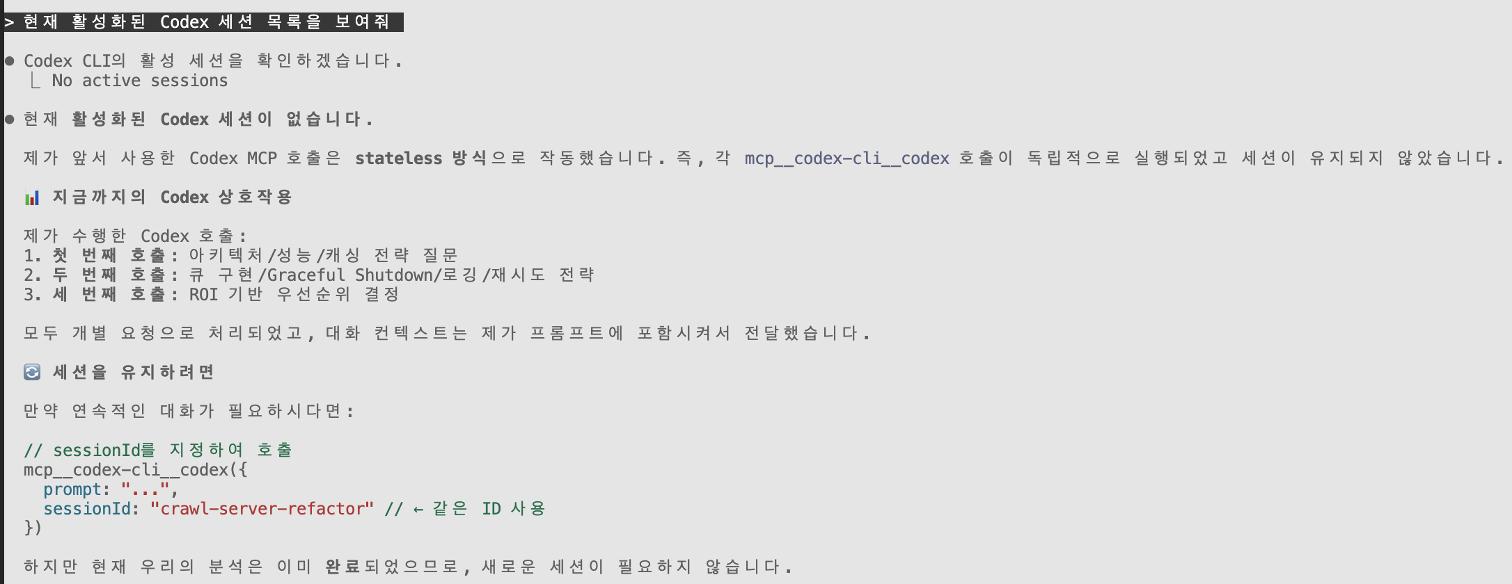 Codex MCP 서버는 세션 관리 기능을 제공한다. 세션을 활용하면 이전 대화의 맥락을 이어서 작업할 수 있다.