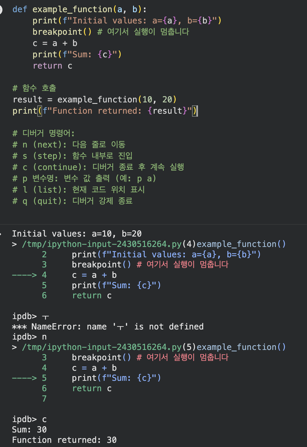 Ctrl + Enter(Mac:Cmd + Enter): 현재 셀 실행Shift + Enter: 현재 셀 실행 후 다음 셀로 이동 (없으면 새 셀 생성)Alt + Enter(Mac:Option + Enter): 현재 셀 실행 후 아래에 새 셀 삽입