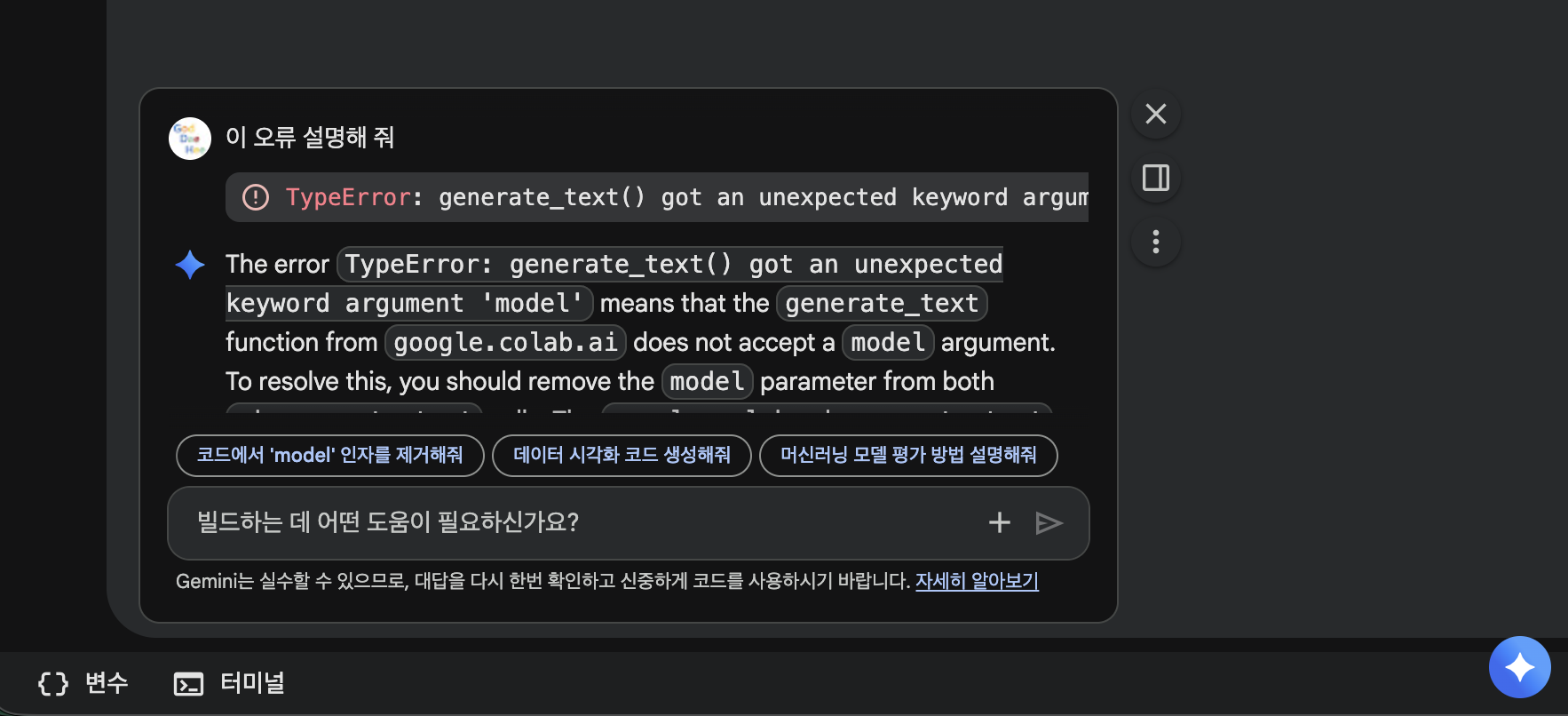 # - 코드 생성: 빈 셀에 자연어 입력 → Gemini가 코드 자동 생성