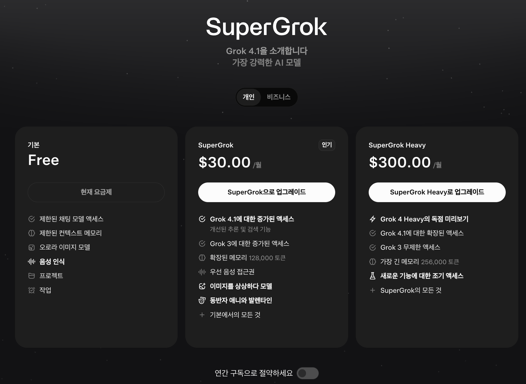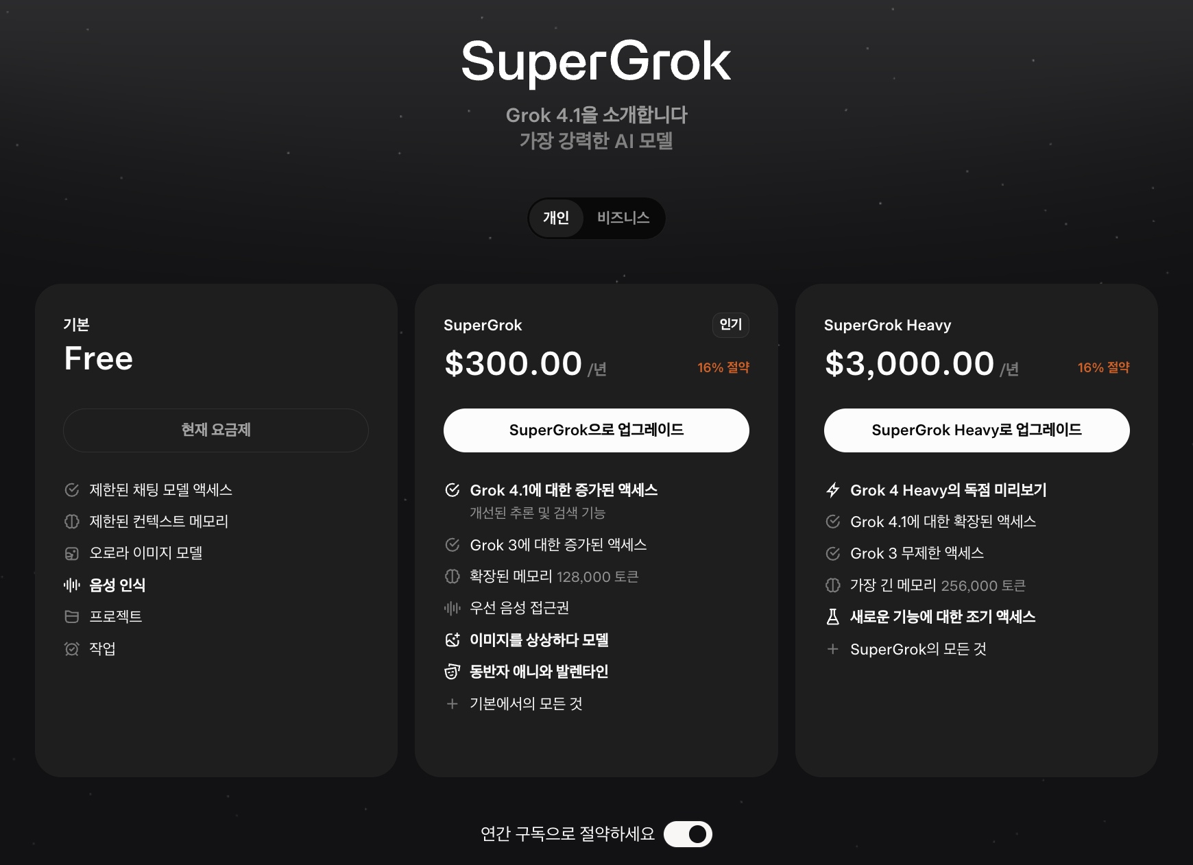 현재 나는 과금을 아직 고민중인 단계로, 무과금유저 이다 보니 선택에 제한이 걸려있는 듯 하다. 그리고 현시점 (11월 18일) 그록 구독 정책도 캡쳐해 두려고 한다.