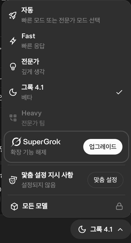 2025년 11월 17일 출시된 Grok 4.1은 실제 사용성에서 중요한 개선을 이룬 최신 모델이다. 창의적, 감정적, 협업적 상호작용에서 탁월한 능력을 보이며, 미묘한 의도를 더 잘 파악하고 일관된 성격을 유지하면서도 이전 모델의 날카로운 지능과 신뢰성을 완전히 유지한다.
