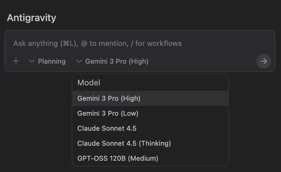 - 구글에서 출시 했음에도 Claude Sonnet 4.5, GPT-OSS 120B 등 개발자들에게 익숙한 모델까진 선택 가능 하다. (Opus같은 비싼 모델은 모이지 않았다.)