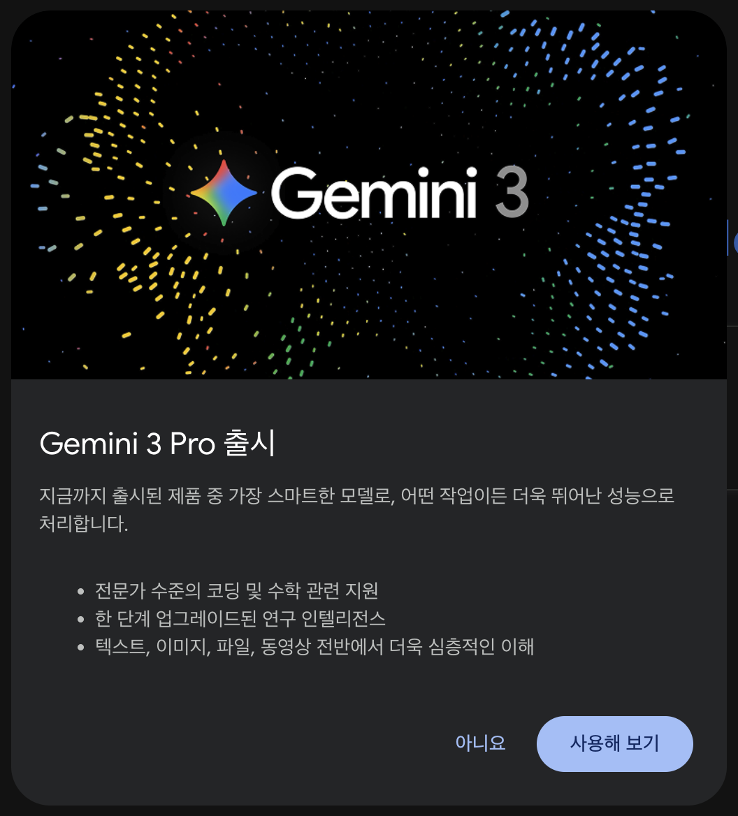 이에 캐시를 지우고 새로고침을 해봤더니 다음과 같이 "Gemini 3 Pro 출시"를 안내하는 팝업을 보게 되었다!!