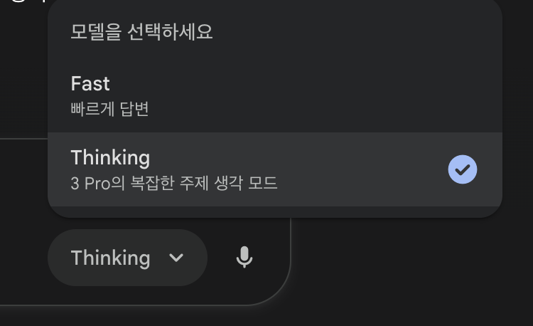 - 사고 모드, Fast Mode 및 모델 선택 화면