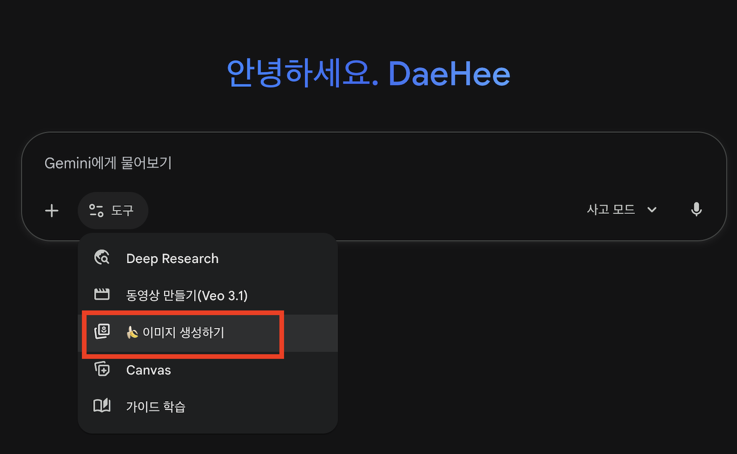 공식 가이드에 따르면, 도구 메뉴에서 "🍌이미지 만들기"를 선택한 후 원하는 모델(빠른모드 : Nano Banana 또는 사고모드: Nano Banana Pro)을 선택하여 사용할 수 있다.