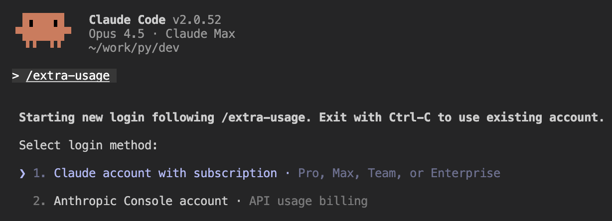 >/extra-usage 로그인 방법 선택: 1. Claude account with subscription · Pro, Max, Team, Enterprise 2. Anthropic Console account · API usage billing