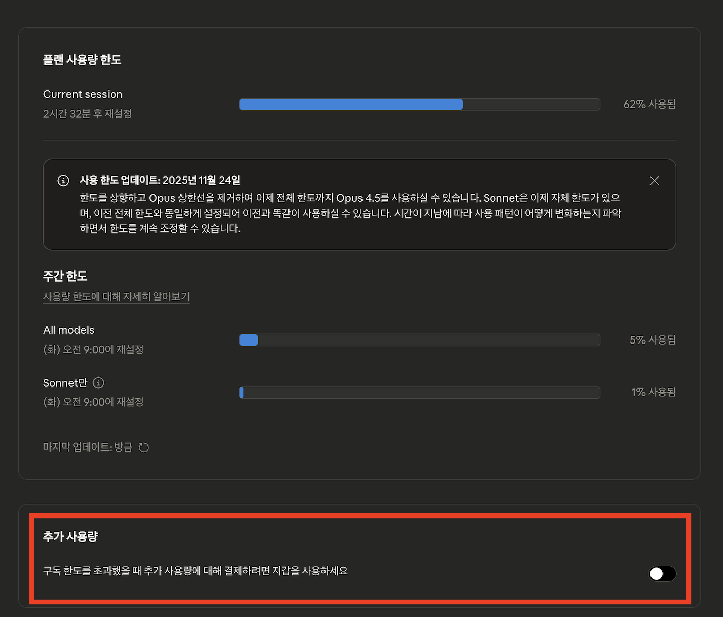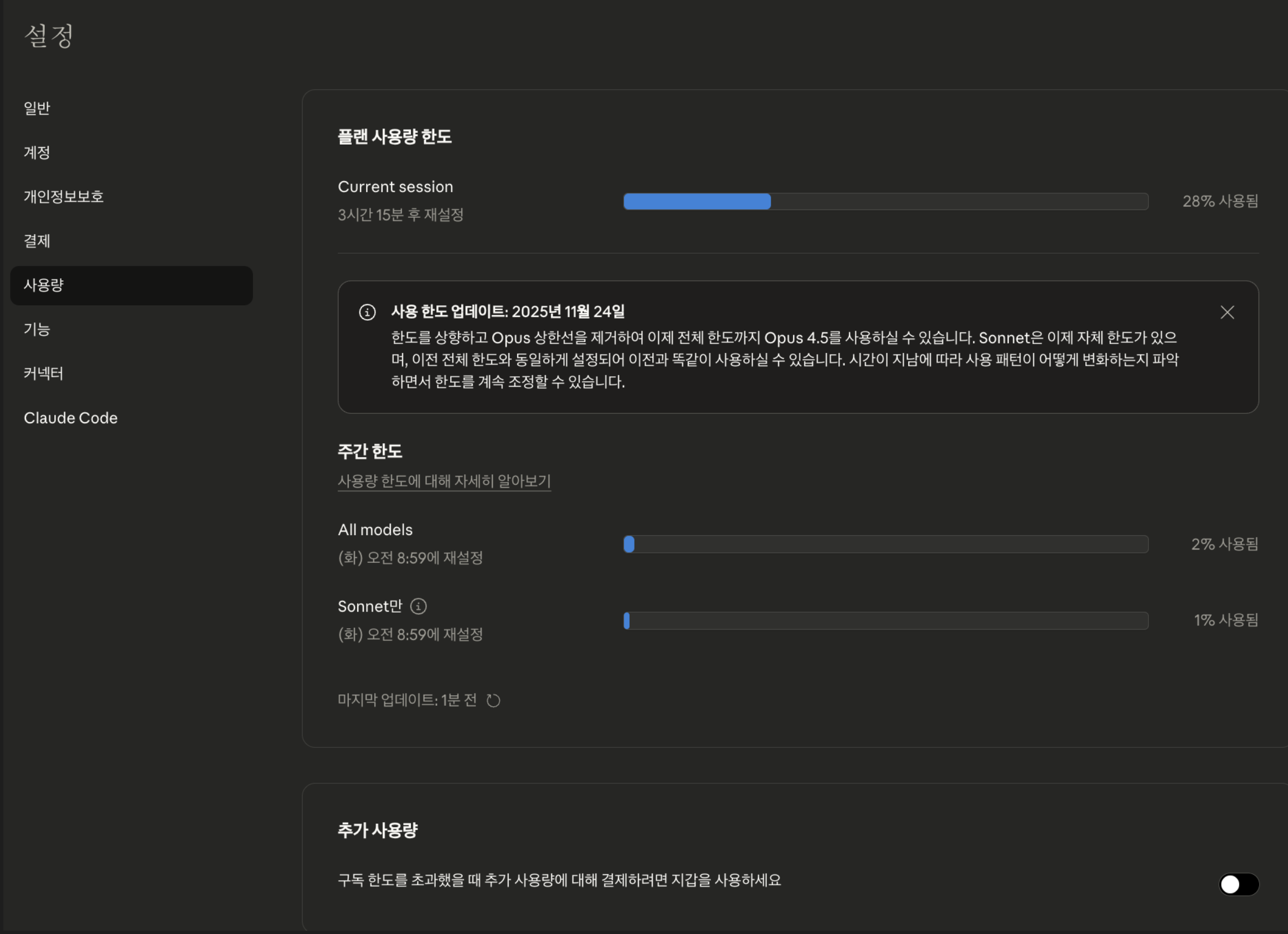 위 화면에서 볼 수 있듯이, "All models"와 "Sonnet만" 한도가 분리되어 표시된다. 이는 Opus 사용에 제약 없이 전체 한도를 활용할 수 있음을 의미한다.