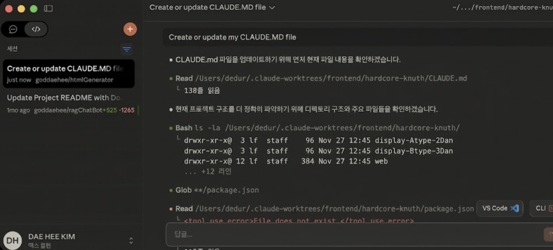 터미널 대신 GUI로 Task, Grep, Read, Edit 등의 도구 실행 과정을 시각적으로 확인할 수 있다.