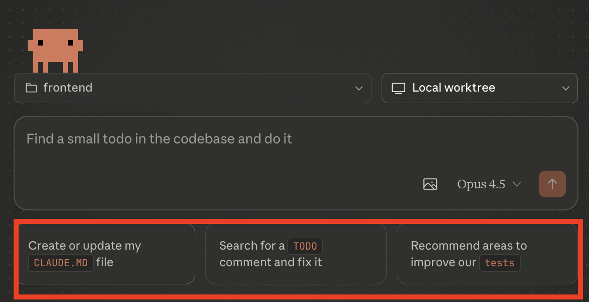 프로젝트의CLAUDE.md파일을 생성하거나 업데이트한다. 이 파일에는 프로젝트 컨벤션, 아키텍처 패턴, 팀 워크플로우 등을 정의할 수 있다. - "Search for a TODO comment and fix it"