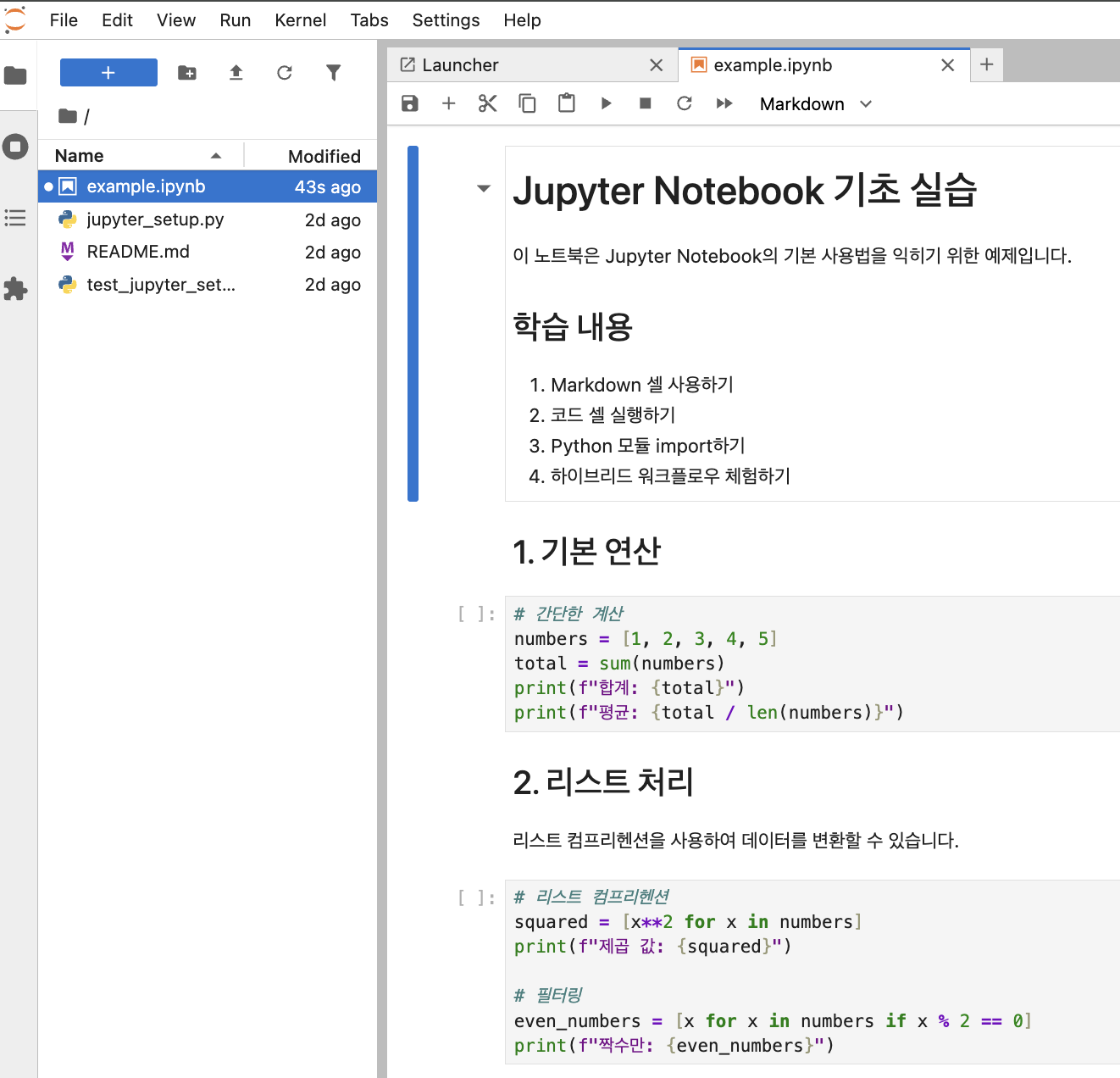 ex) 상기 브라우저 웹 인터페이스와 조금 다른 화면이 뜨고, example.ipynb 파일을 클릭하여 실행해보자.