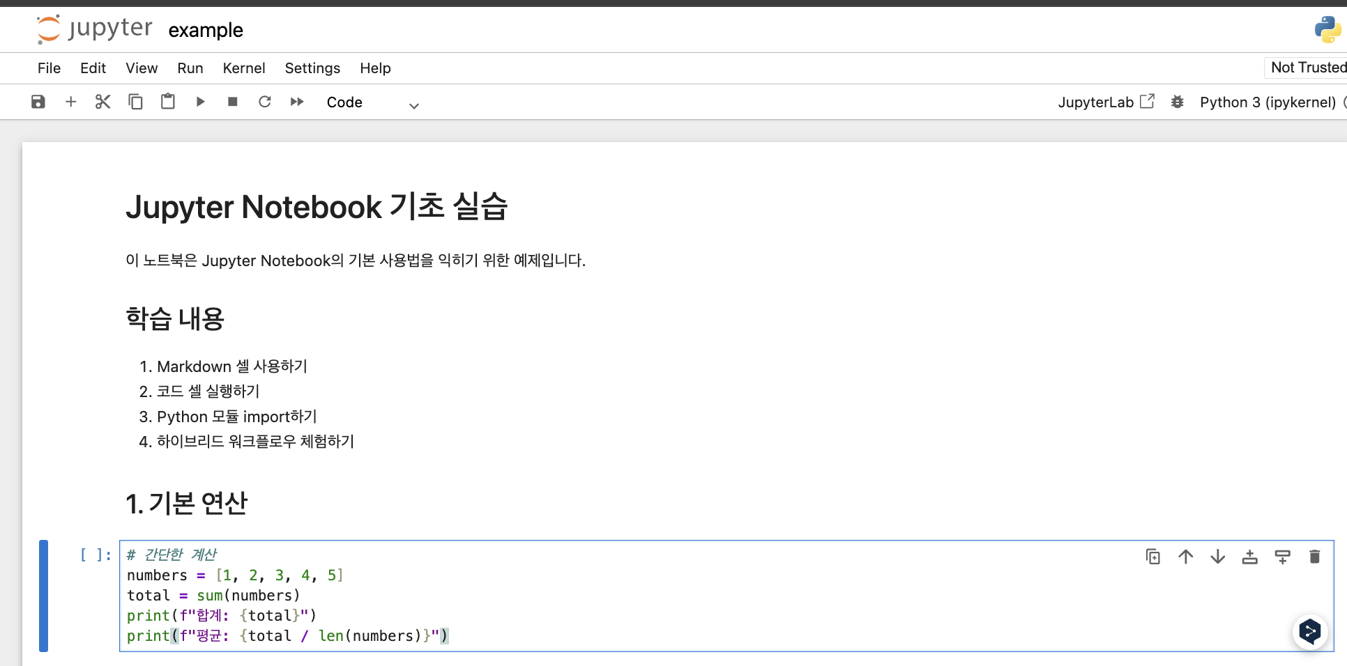 • 셀 실행 순서: 셀을 위에서 아래로 순서대로 실행해야 한다. 순서가 뒤섞이면 예상치 못한 결과가 발생할 수 있다.
