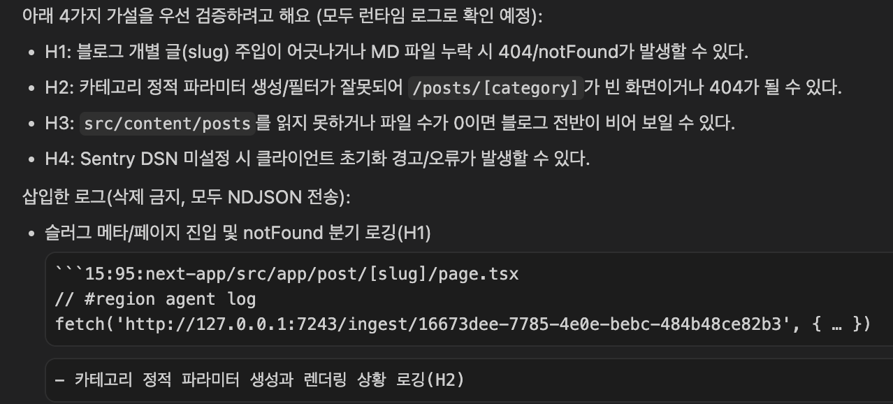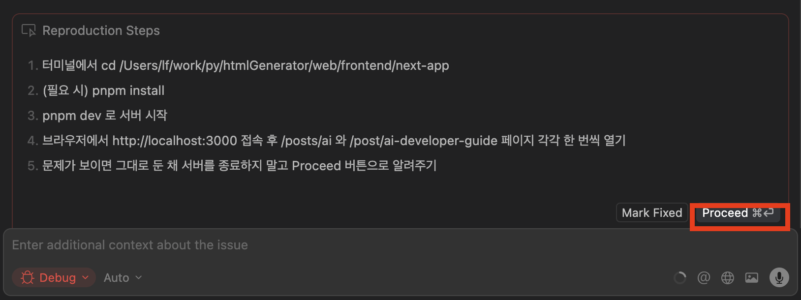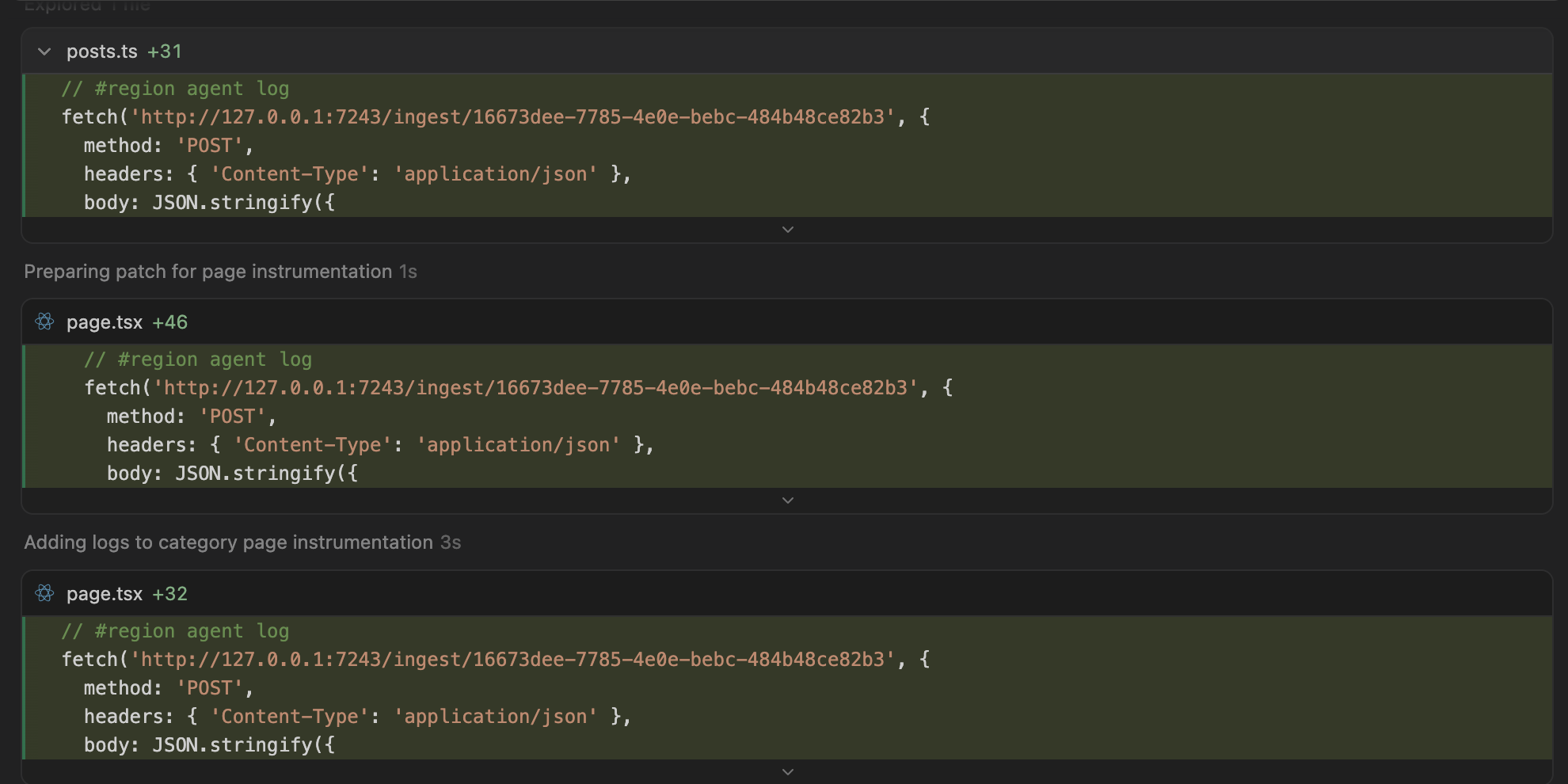 에이전트가 Cursor 확장 내 로컬 디버그 서버로 데이터를 전송하는 로그 문을 삽입한다. 각 가설을 테스트하기 위한 구체적인 데이터를 수집하도록 설계된다. - Step 3: Reproduce the Bug (버그 재현)