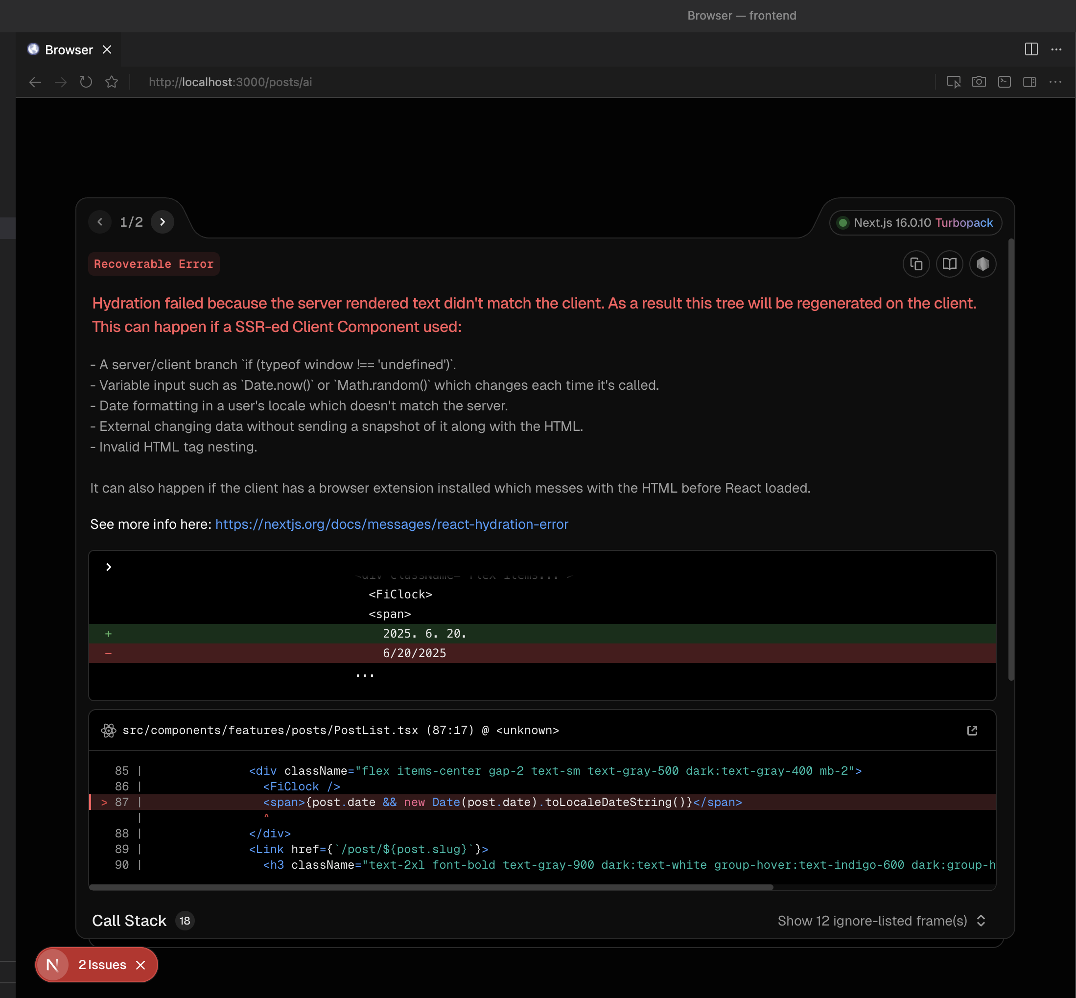 - 상기 4번 내용 진행 ( 브라우저에서 http://localhost:3000 접속 후 /posts/ai 와 /post/ai-developer-guide 페이지 각각 한 번씩 열기 )