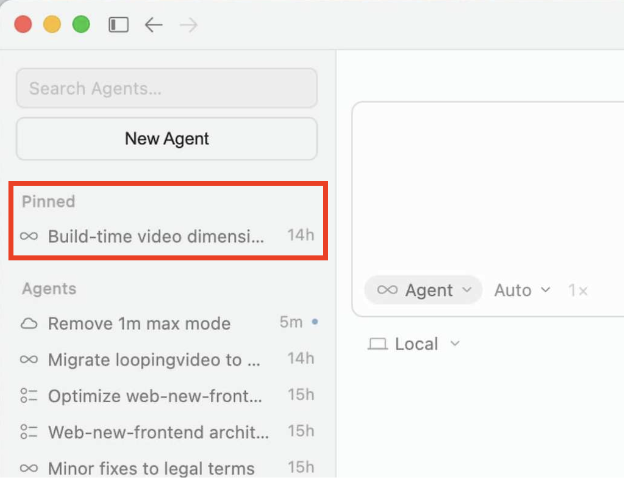 Pinned Chats는 상대적으로 단순하지만 실용적인 편의 기능이다. 공식 문서에 따르면 "에이전트 사이드바에서 향후 참고용으로 채팅을 상단에 고정할 수 있다"고 설명한다. 중요한 대화를 상단에 고정하여 나중에 쉽게 접근할 수 있다.