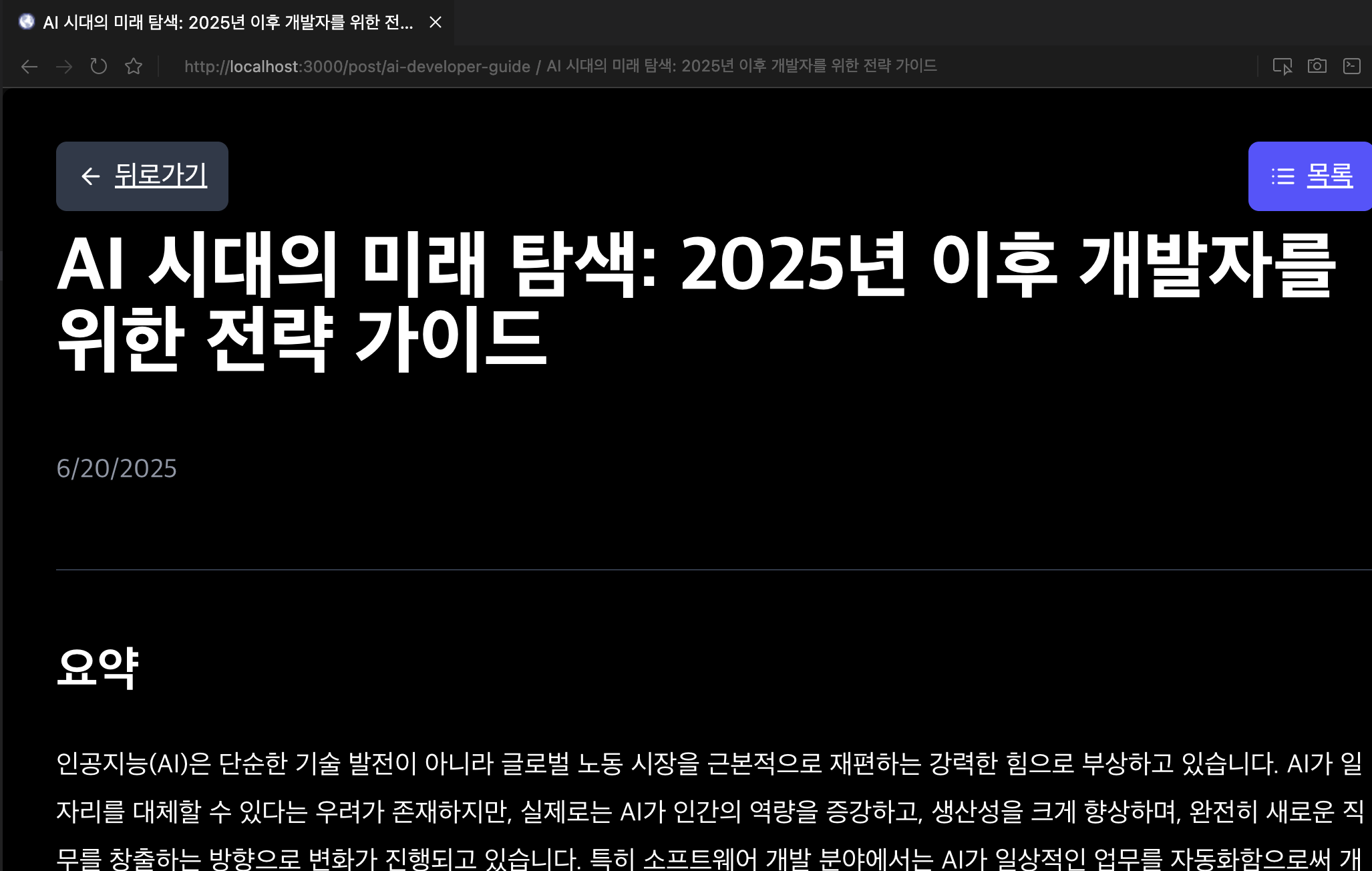 4. 브라우저에서 http://localhost:3000 접속 후 /posts/ai 와 /post/ai-developer-guide 페이지 각각 한 번씩 열기