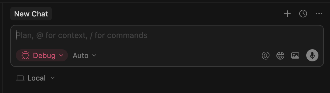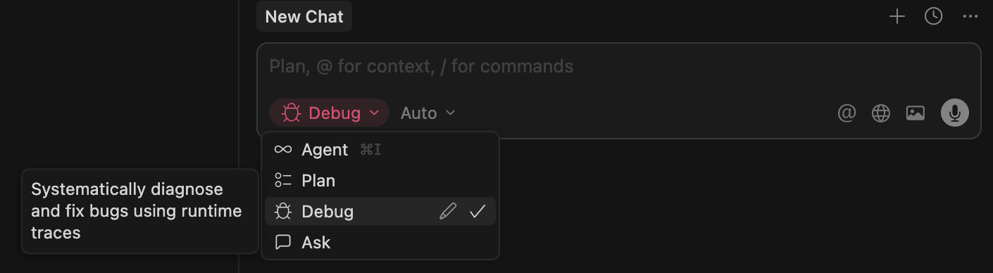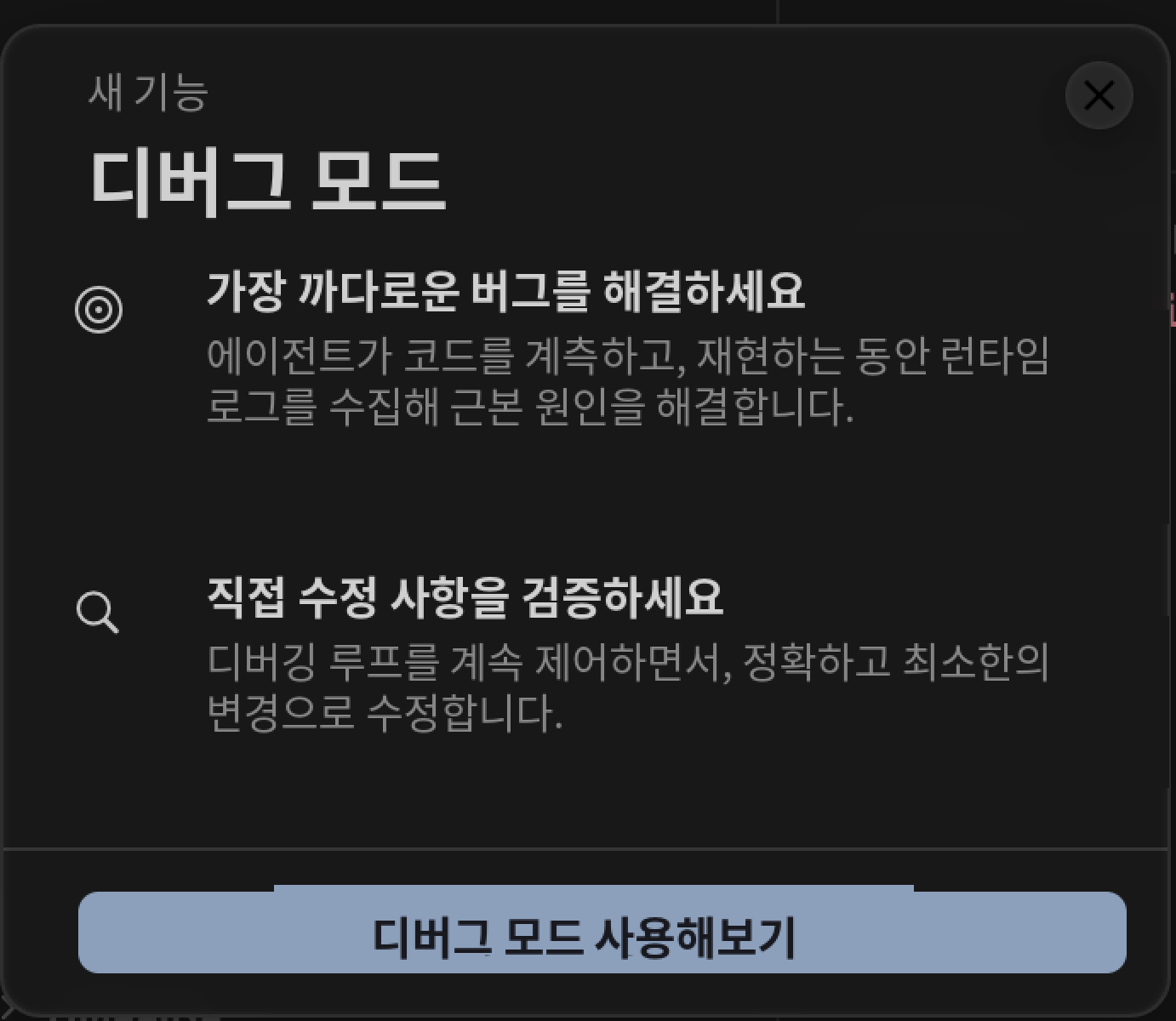 - Agent 패널의 드롭다운 메뉴에서 "Debug Mode" 선택