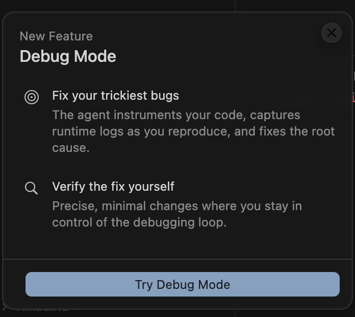 "Debug Mode helps you reproduce and fix the most tricky bugs. Cursor instruments your app with runtime logs to find the root cause. It works across stacks, languages, and models."