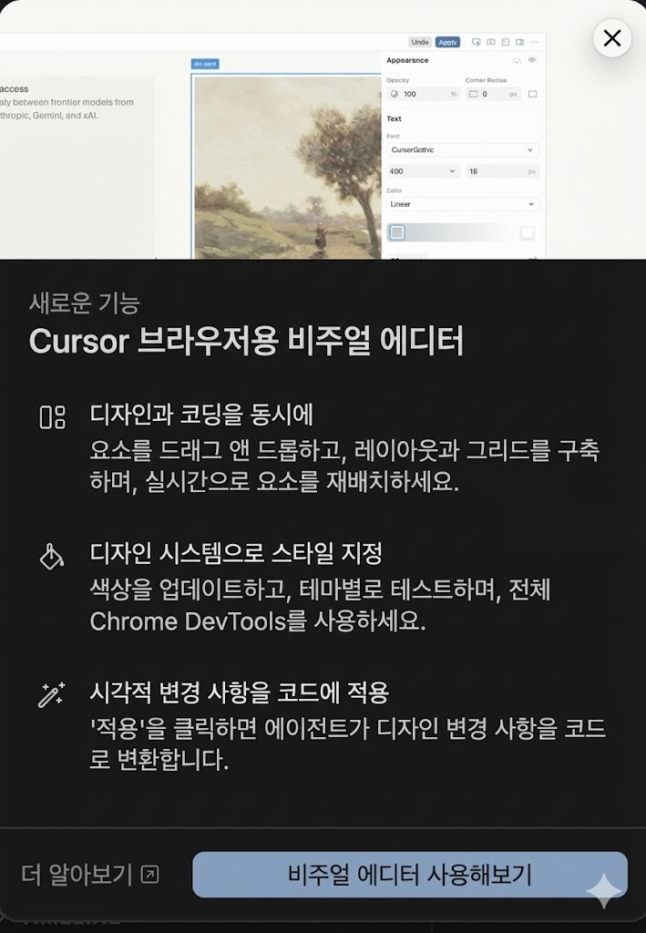 물론 아직 초기 버전이므로 Visual Editor의 버그나 지원 범위의 불확실성 등 개선이 필요한 부분도 있다. 그러나 전반적인 방향성은 명확하다: AI 코드 에디터는 점점 더 개발자의 전체 워크플로우에 깊이 통합되고, 더 많은 작업을 자동화하는 방향으로 나아가고 있다.